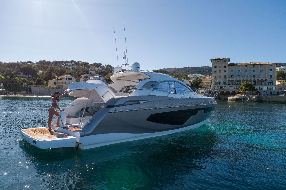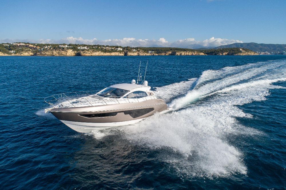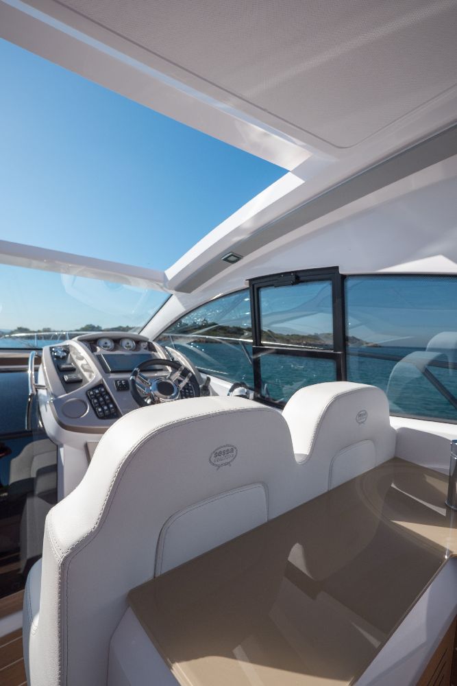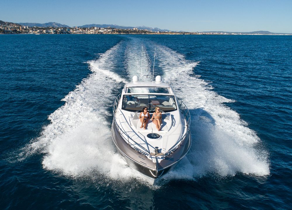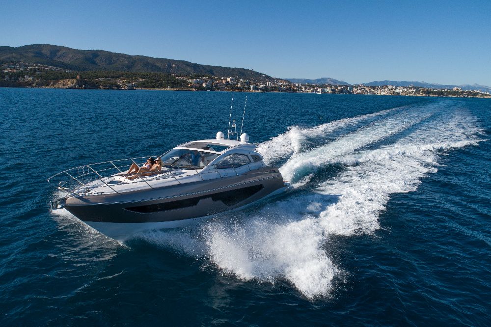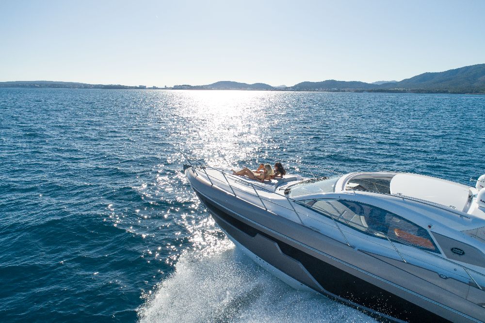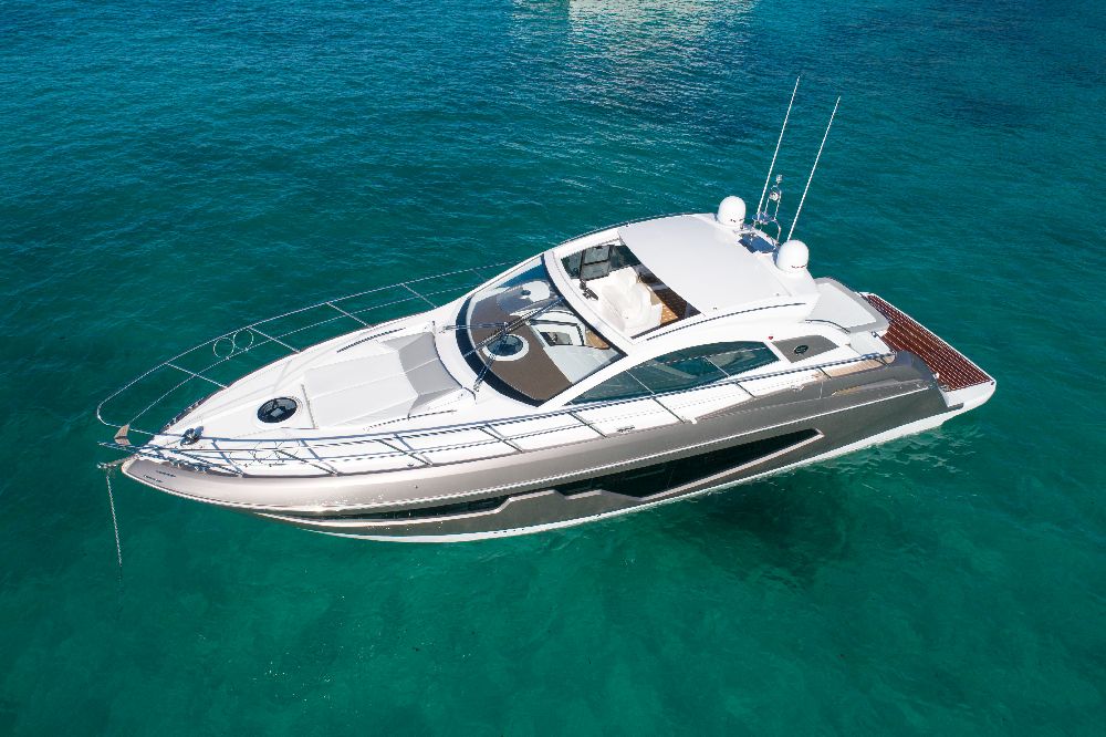 Yacht C44, Yacht Line series. The new C44 is further characterized by its elegance and sportiness. The resized windows also improve the brightness in the cabins, bathrooms, and main saloon. The electric hardtop cover is made of glass to also increase the brightness of the cabin.