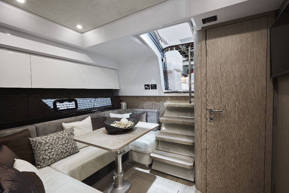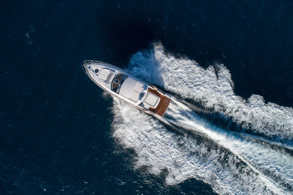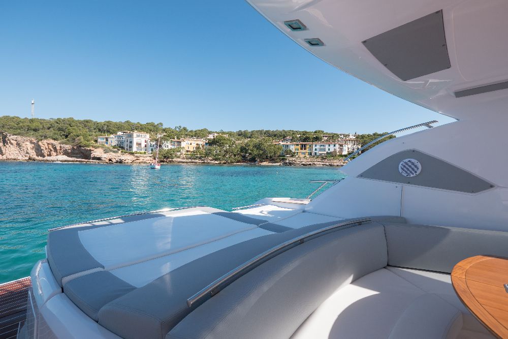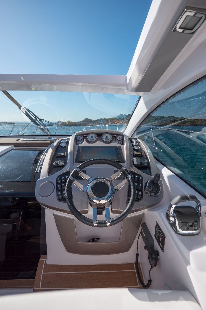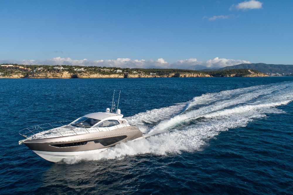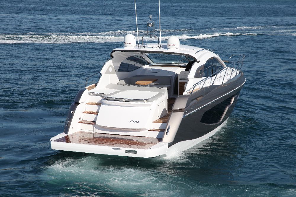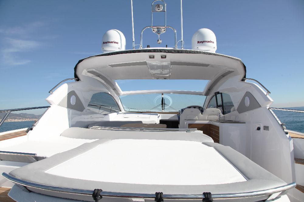 Yacht C44, Yacht Line series. The new C44 is further characterized by its elegance and sportiness. The resized windows also improve the brightness in the cabins, bathrooms, and main saloon. The electric hardtop cover is made of glass to also increase the brightness of the cabin.