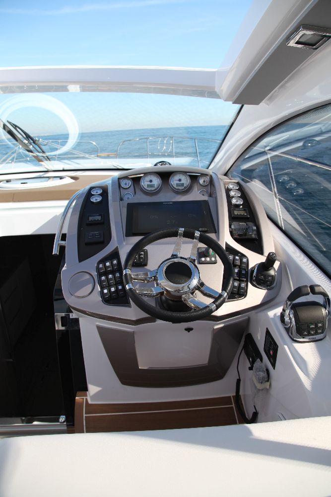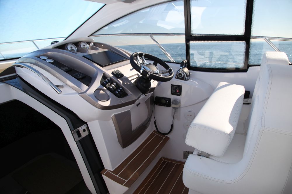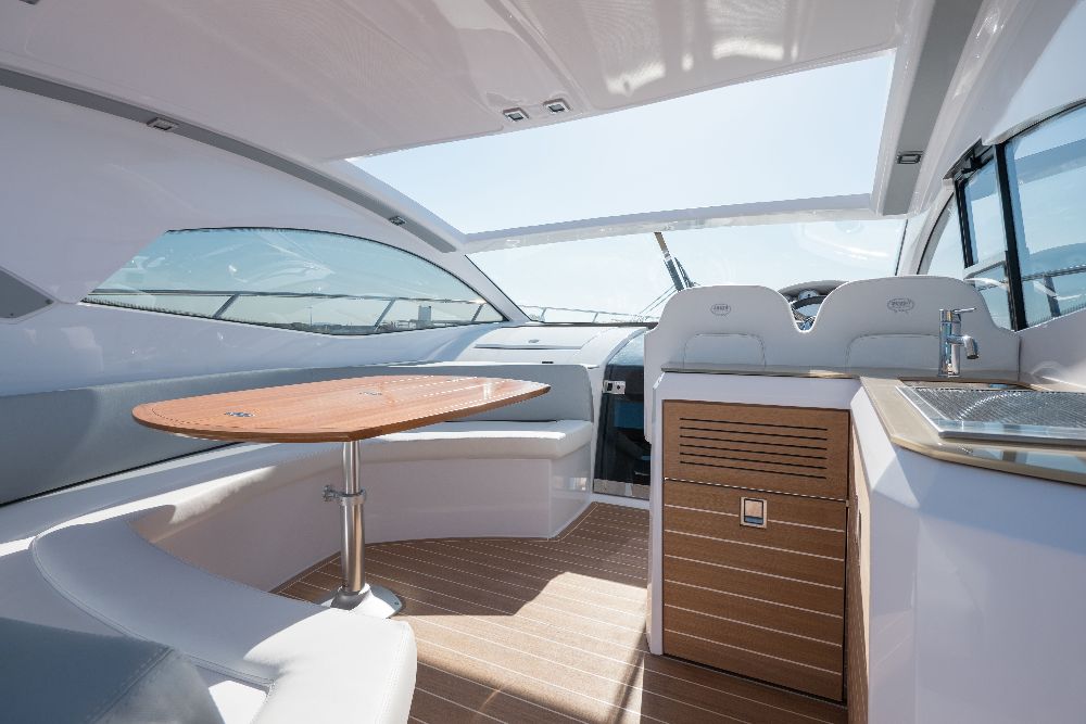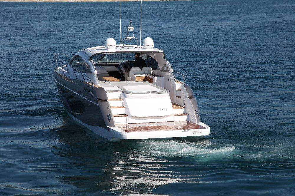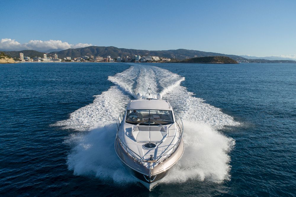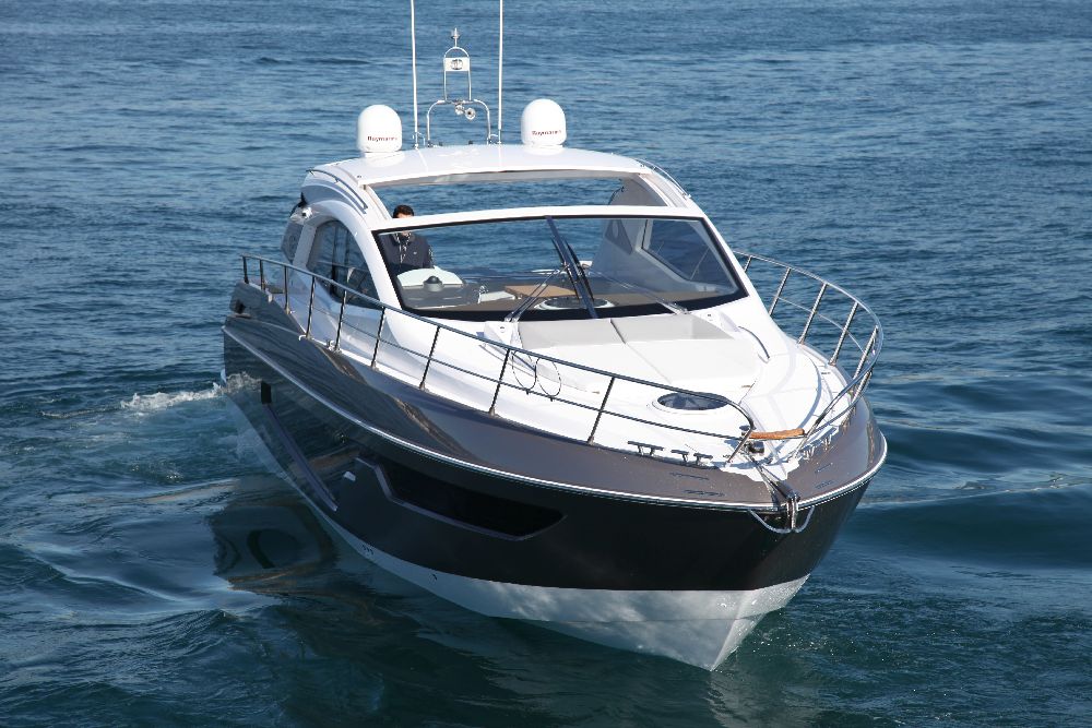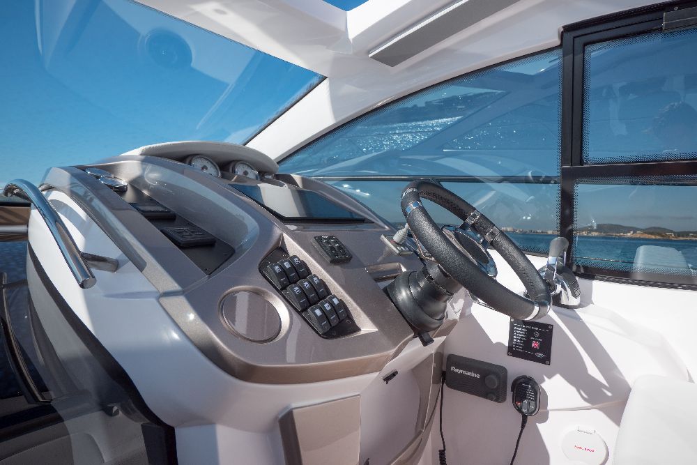 Yacht C44, Yacht Line series. The new C44 is further characterized by its elegance and sportiness. The resized windows also improve the brightness in the cabins, bathrooms, and main saloon. The electric hardtop cover is made of glass to also increase the brightness of the cabin.