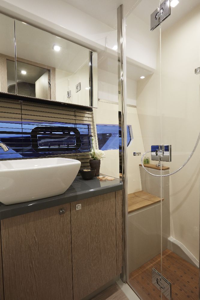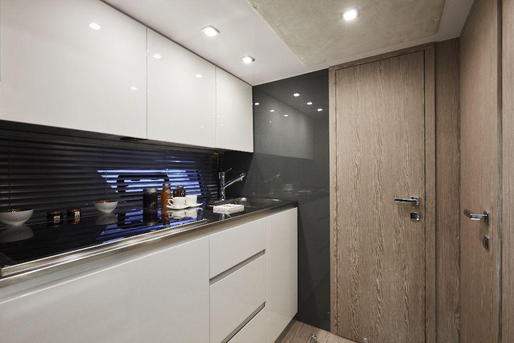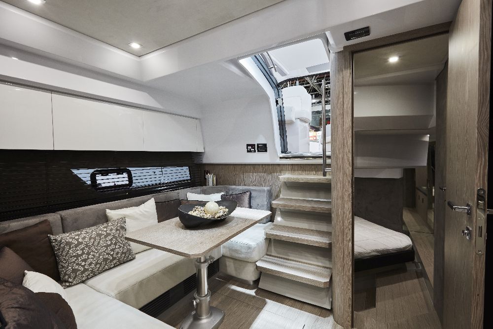 Customers can choose between 18 different types of wood, leather, and fabric for the cabins. The cabin layout is available in two different styles: a simple version with a deck saloon, a large sundeck, and a tender garage in the rear; and the double version, with two L-shaped sofas and a comfortable table for 12 guests.