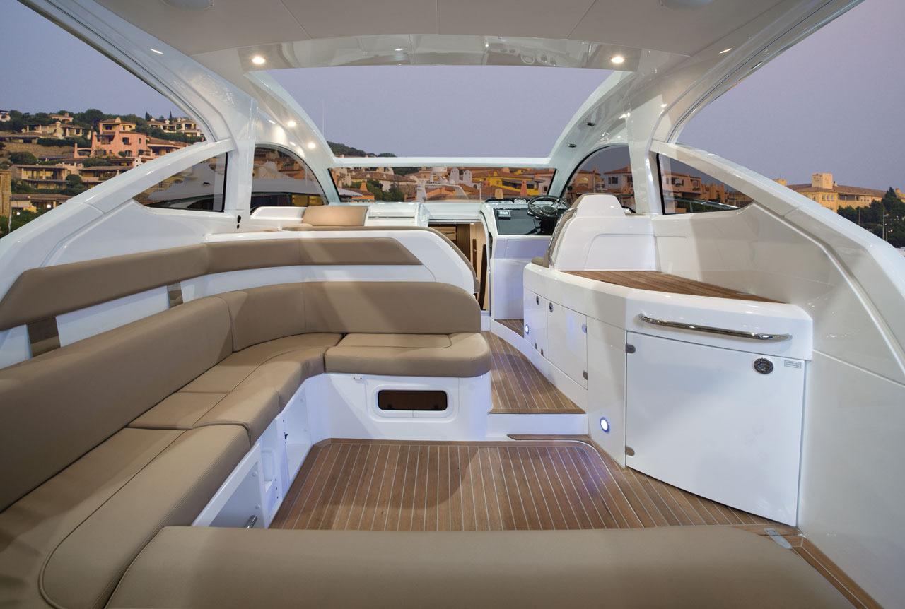 The Targa 38OPEN offers the largest opening roof area for a boat of this size and a long overhang over the cockpit for maximum protection. The glazing has been extended to provide greater visibility in all directions and further enhance the feeling of an express cruiser that is open to the world around it.