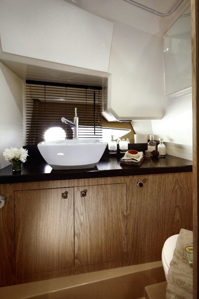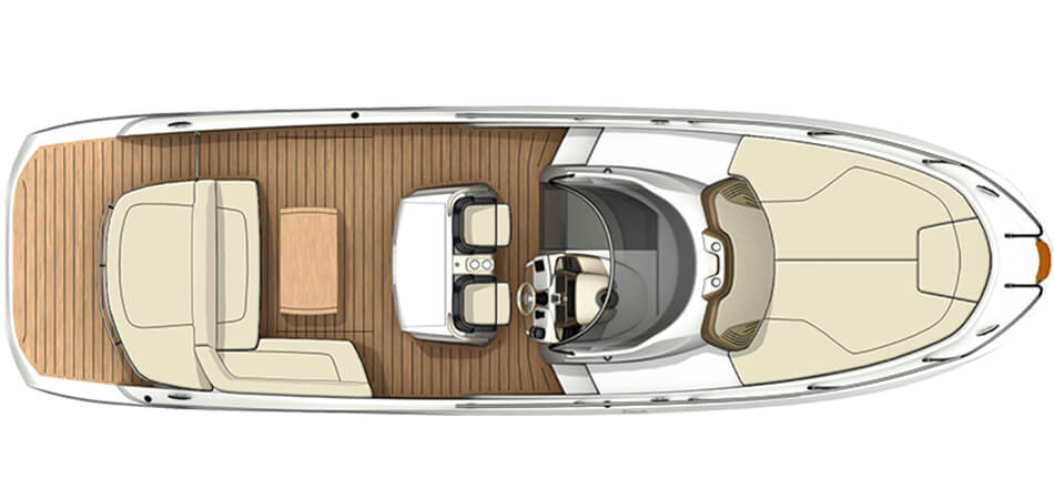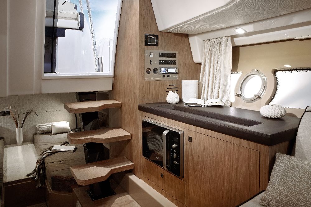 In fact, the KL 34 Inboard offers an exceptionally large swim platform that covers the engines so children can swim safely, an extendable sun deck by reclining the sofa backrest, a large cockpit with a folding center table, and a great cocktail area with a complete teak kitchen unit with sink, refrigerator, and ice maker.
