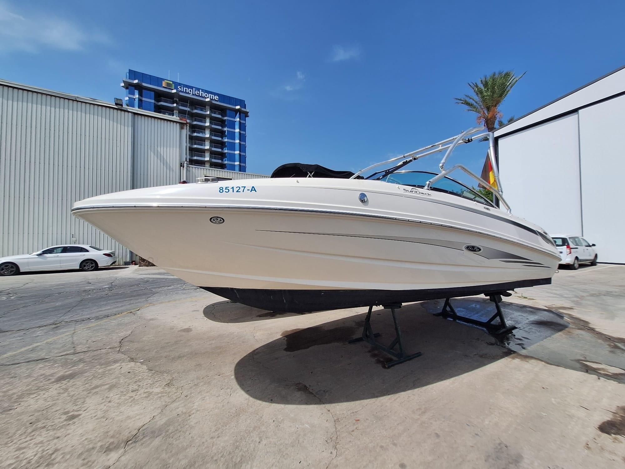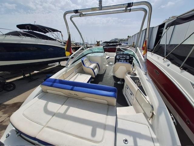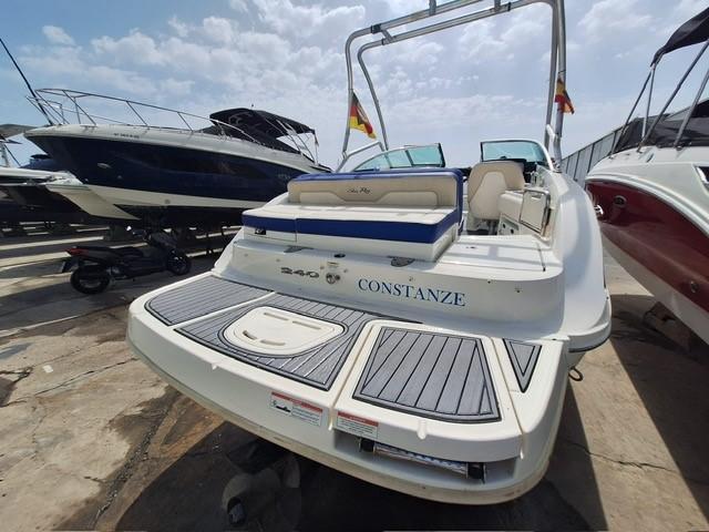 Open bow with two sunbeds in the bow and filler cushions. Head compartment to port. Swivel seat for driver and passenger. L-shaped bench seat in the stern with folding backrest convertible into a sun deck. Wet bar on starboard with sink, tap and compartment underneath. Extended swim platform with ladder. Tower for water sports. >German flag. Requires full engine and outdrive service due to years of inactivity. Original exhaust manifolds, we recommend complete replacement of elbows and manifolds.