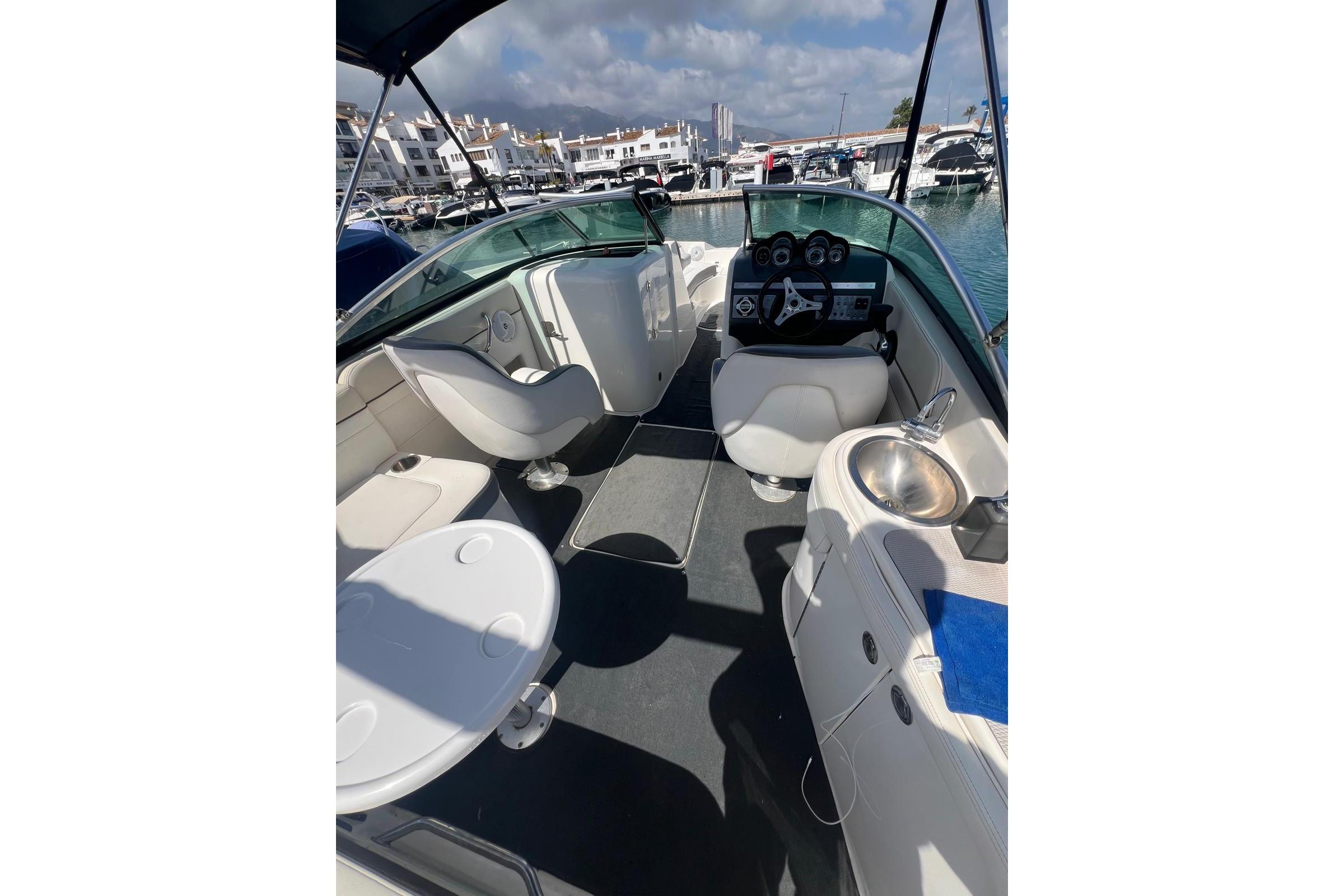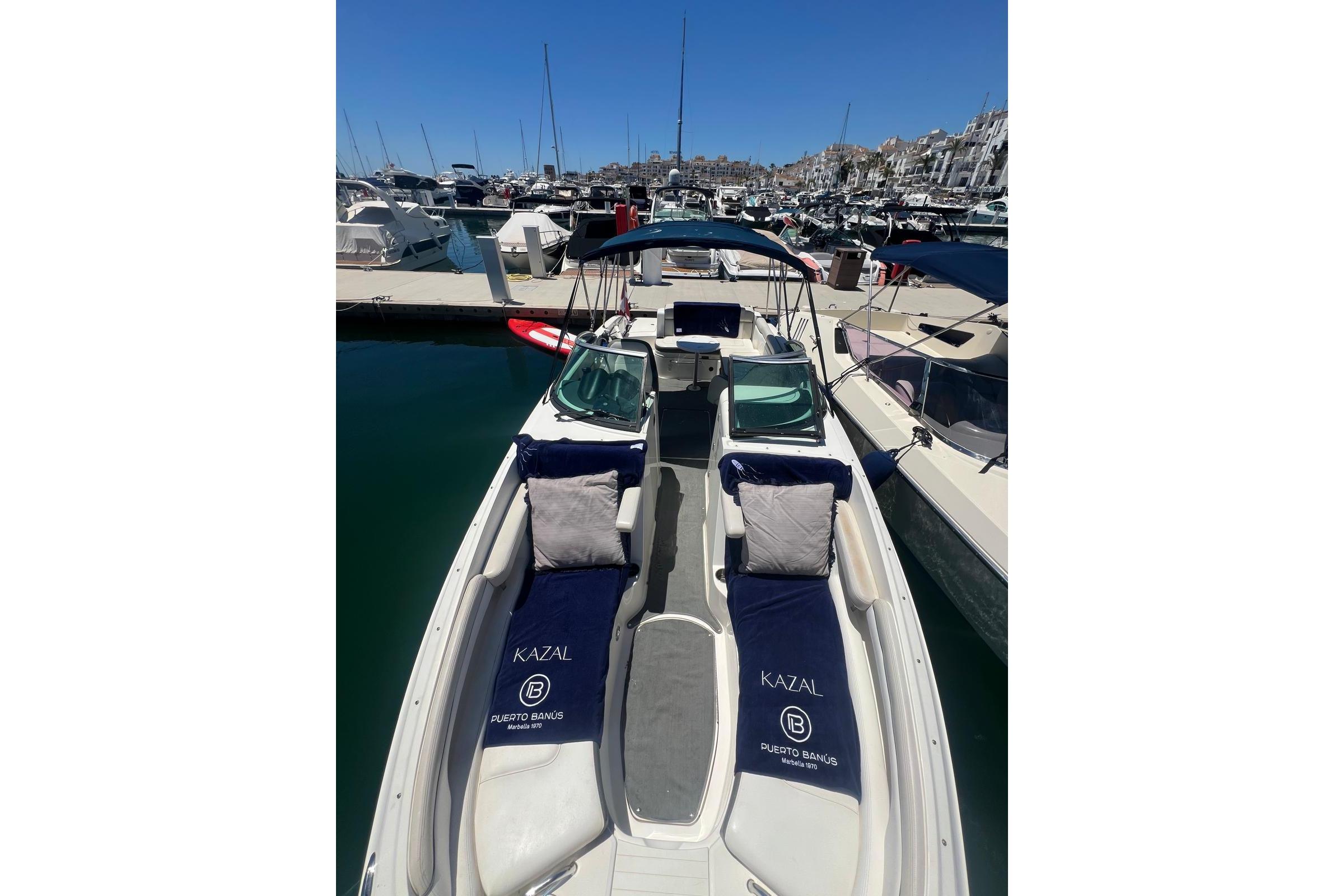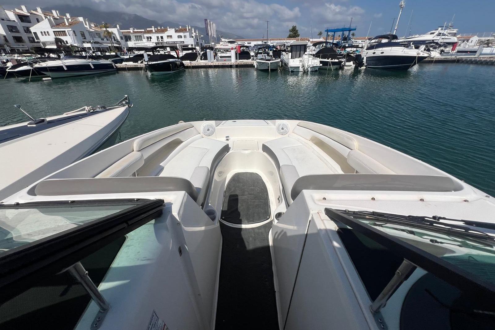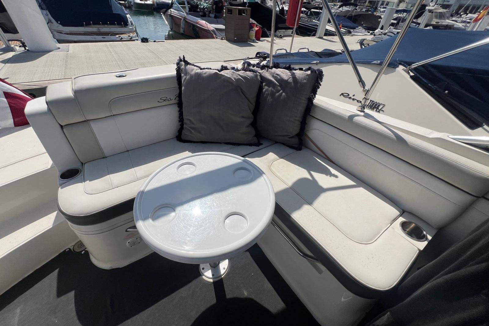 Open bow with U-shaped sun lounger-style seating and swivel seat for the driver on the starboard side. Passenger seat on the port side with filler cushion and reversible backrest. Aft bench and cockpit walkway to the platform. Aft sundeck and extended swim platform with hidden swim ladder.
