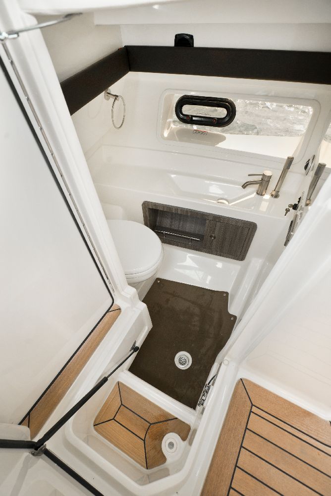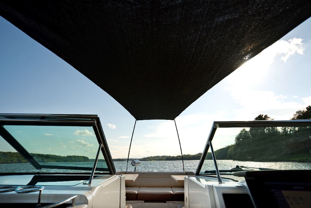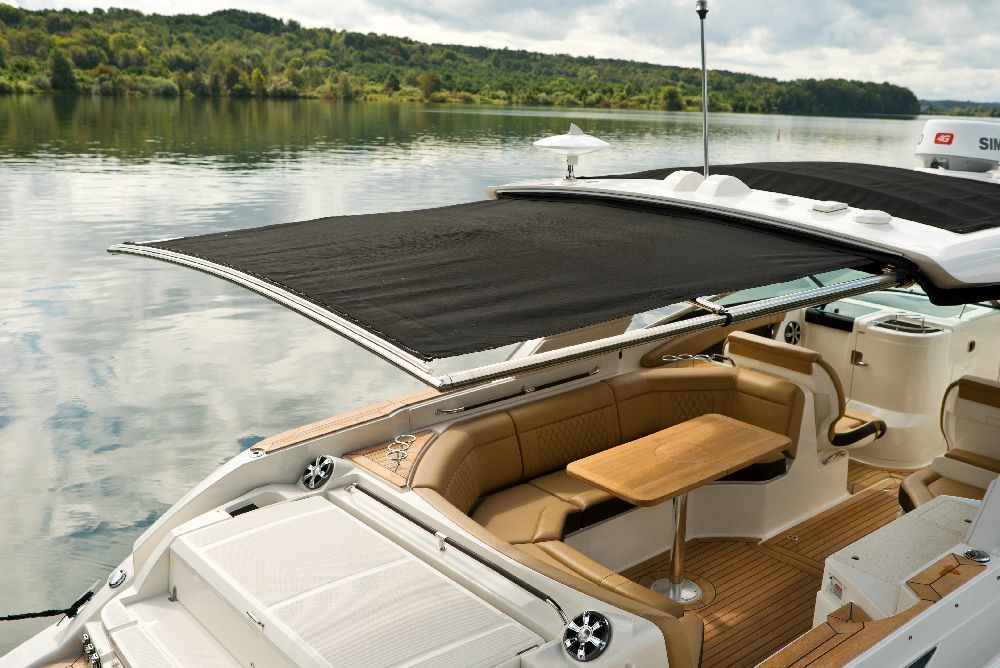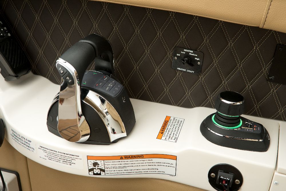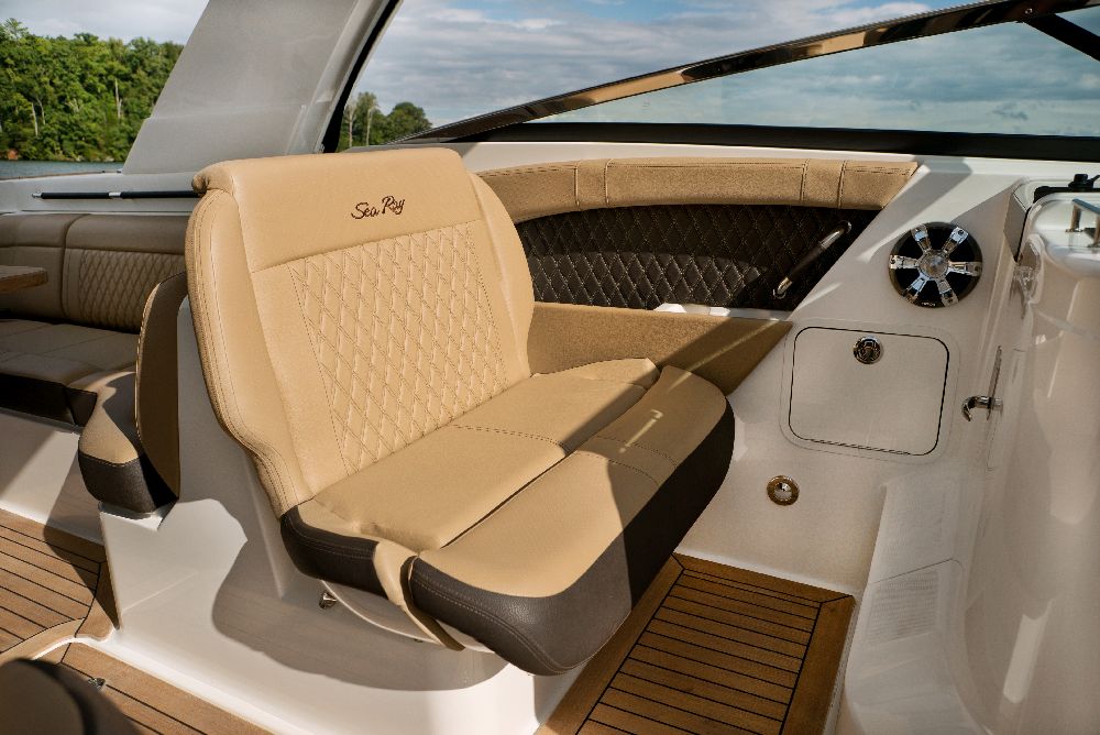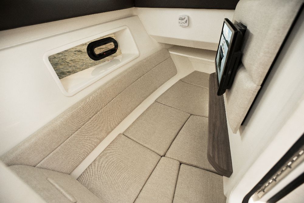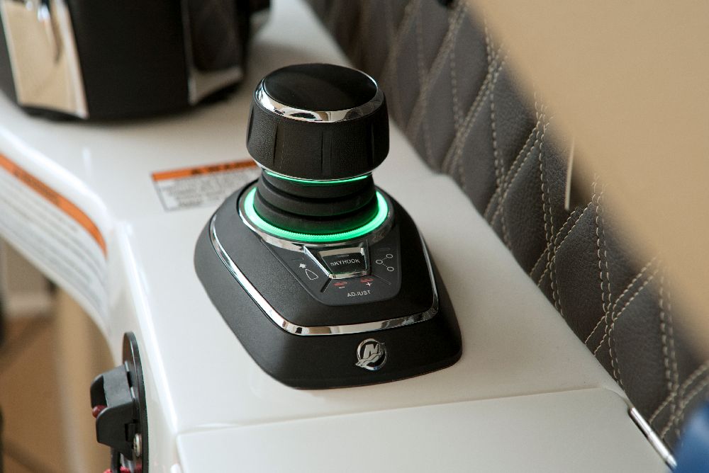 The SLX 350 Outboard incorporates the main features of the SLX and offers a superior boating experience, with twin Mercury® 350 Verado® outboard engines, Mercury’s Joystick Piloting for Outboards, NextWave™ innovations such as quietRIDE™ technology, and the optional Dynamic Running Surface™. In addition, the SLX 350 Outboard has a seating arrangement with capacity for 18 people, creating a more comfortable space for socializing in the cockpit, and hideaway aft-facing sun loungers. The intuitive helm comes standard with twin 9-inch Simrad® touchscreen displays, including Mercury VesselView® Link Data. The Port Hideaway® provides a larger space with air conditioning.