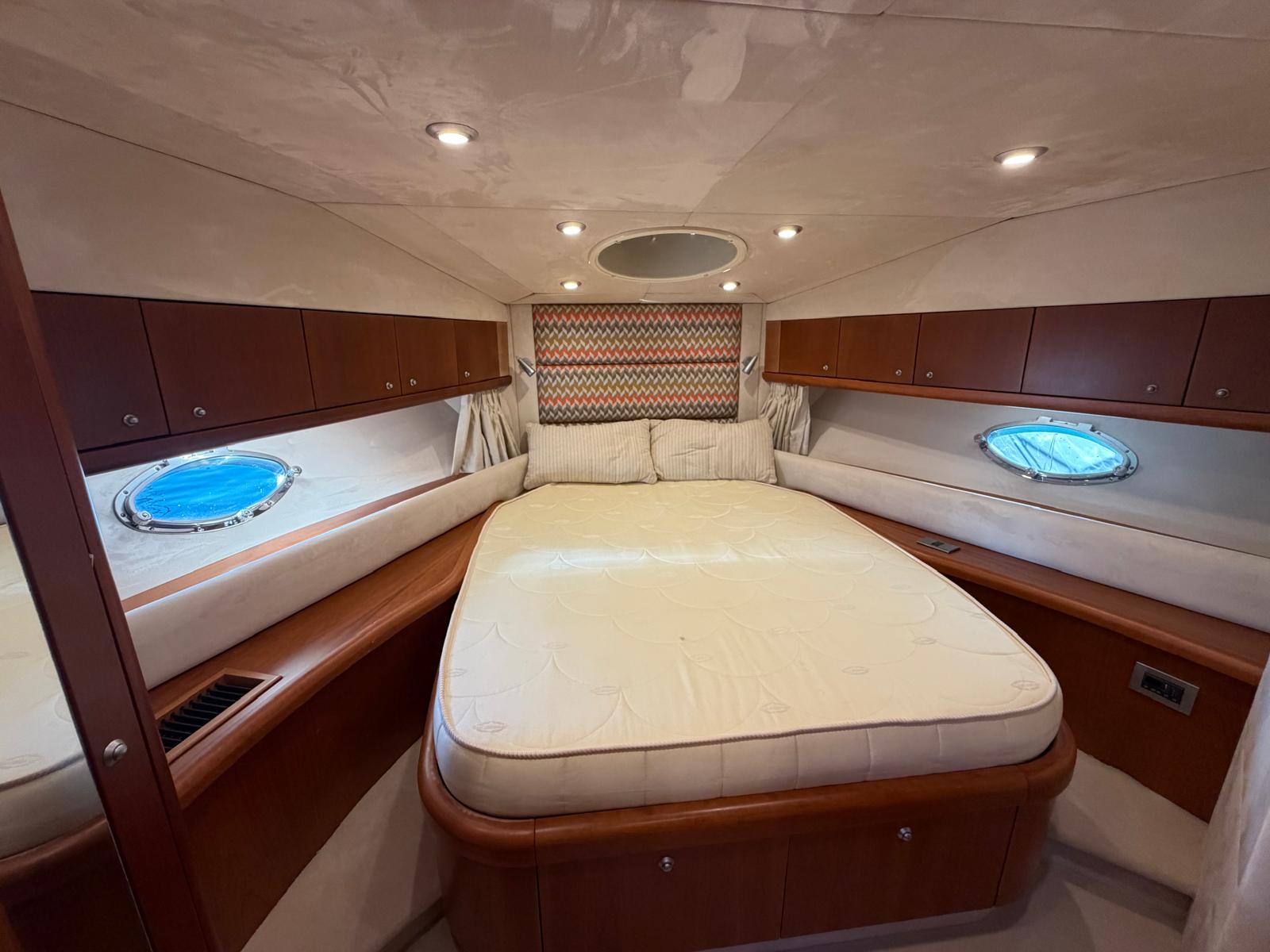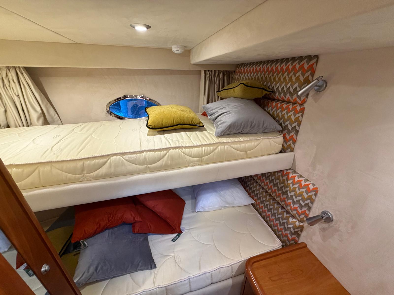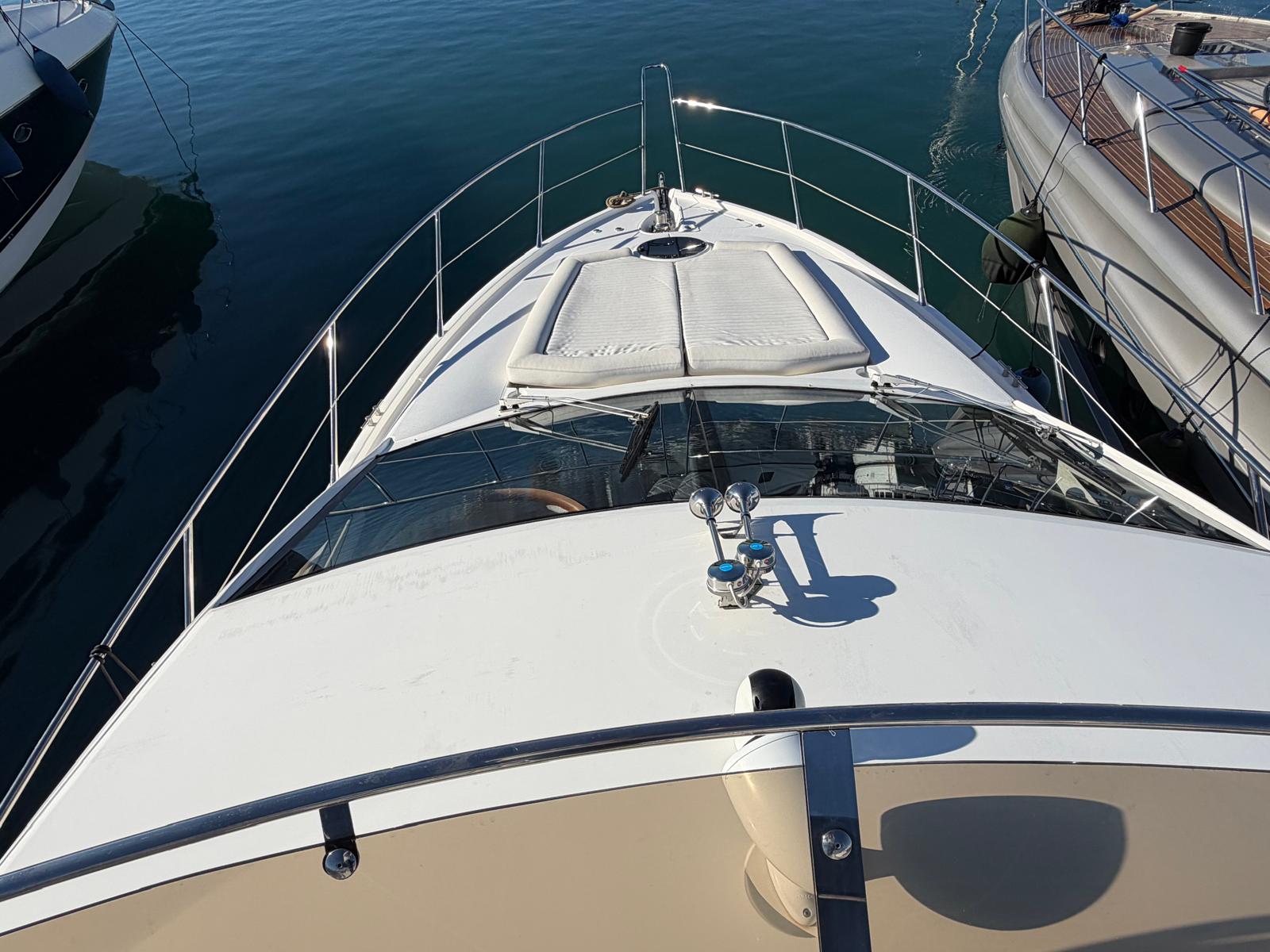 Open bow with starboard cabin. On deck, 3 sunbeds in the bow and port walkway to the cockpit. Double seat for pilot and co-pilot. Cockpit table with U-shaped seat and starboard countertop. Aft sundeck with rotating backrest, facing aft or facing starboard. Bathing platform with submersible hydraulic step. In the cabin, V-seat in the bow convertible into a double bed. Complete bathroom compartment on starboard. In the central part of the boat, two single beds.