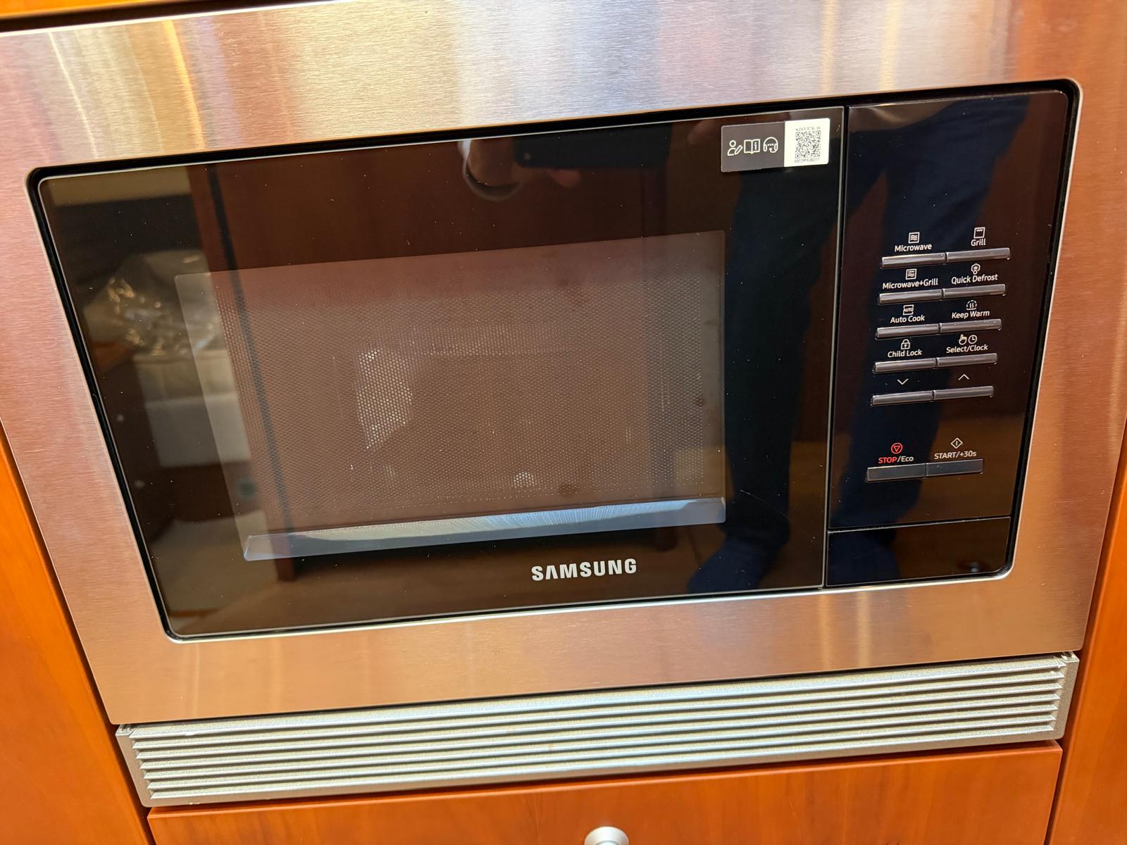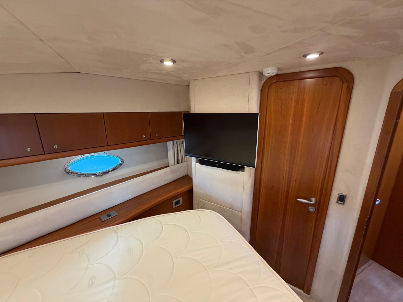 Interior: Double bed in bow, removable Tv, Double bed in the stern, Dinette table for 4 seats,can be transformed in a bed for one person, Sink, Kitchen with ceramic hob, Refrigerator 12V -220V in cabin, Microwave, Bathroom with electric toilet Vacuflush, Shower curtain , General electrical panel 220v-12v, Radio Clarion CD, Various lockers. Removable interior carpet cover, bow porthole with mosquito net, rubbish bin on access ladder. Cabin lights, various portholes (5)
