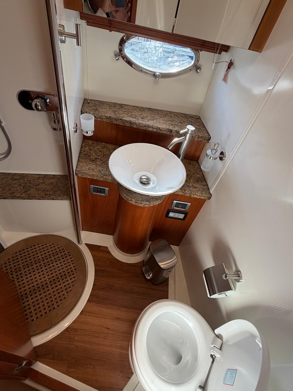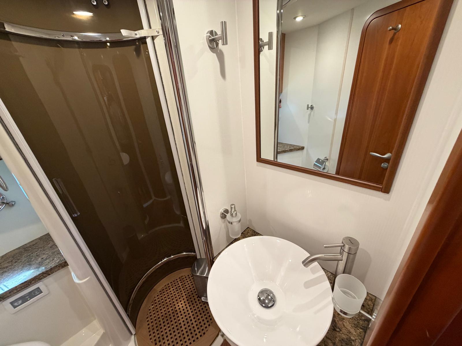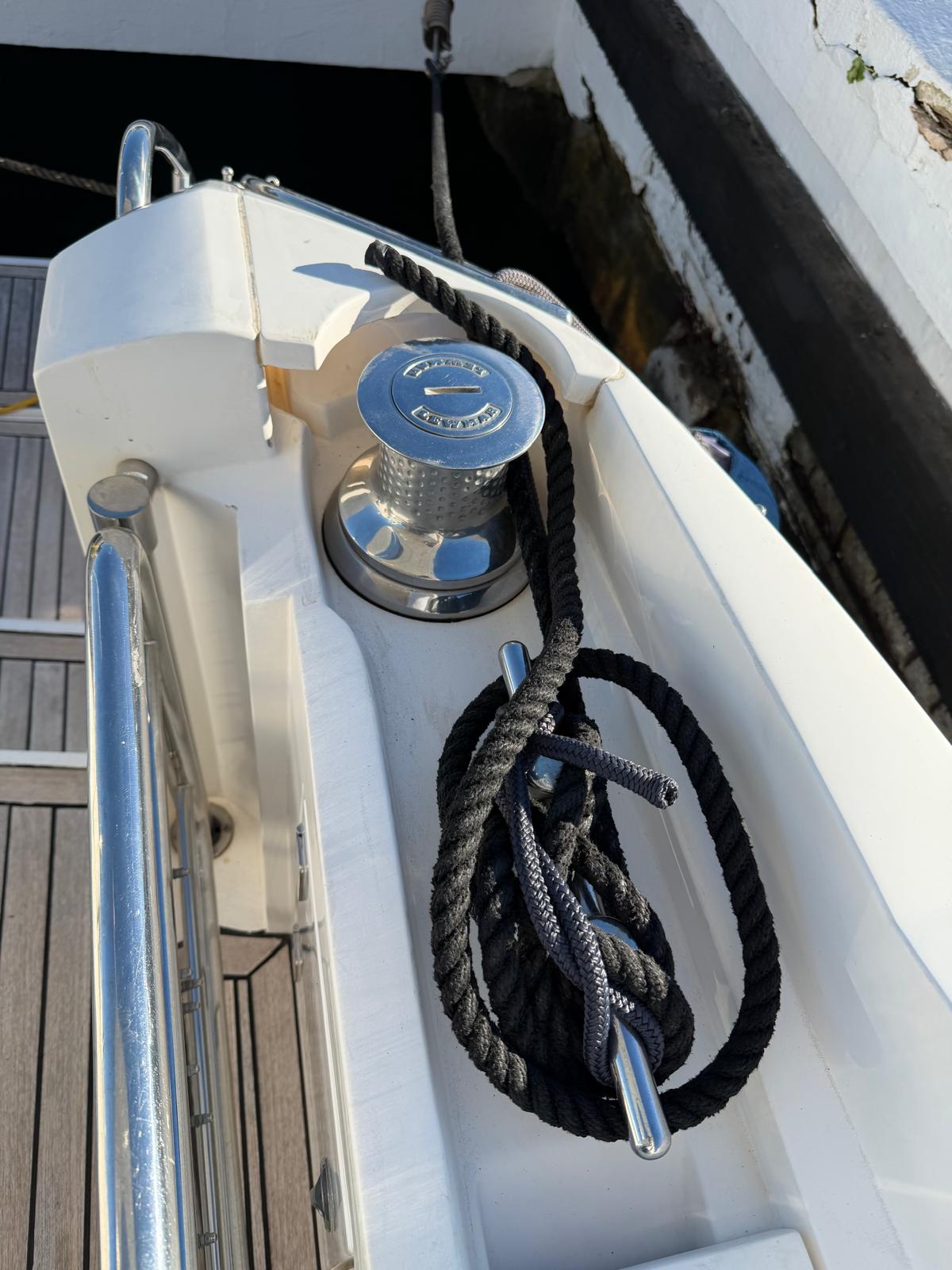 Equipment: Hot and cold Air conditioning, 5Kw Gasoline Generator, Battery charger with charge separator, Double battery disconnector (3 Batt.), Hydraulic flaps,Water heater in bilge, Chain compartment, Electric windlass with foot buttons and Button panel on control panel with Anchor and roller for anchor, VacuFlush Electric Toilet and crusher, Blackwater tank with emptying pump (20lts), Bilge pumps in bilge and in cabin under stairs, Bilge air extractor, 12V Electrical circuit panel in locker with keys starter,220v Plug and cable, Speakers in the cabin and in the cockpit, Electric Arm to lift the engine cover, Stern Shower, Bathing Ladder, Bimini bow and New original Camper Canvas Brand new, Complete new White winter canvas 08/2022, Portable Ice Cooler, Water Pressure Group, Bow Mattresses, cockpit table in bilge, boathook, stick to hold cockpit cover.