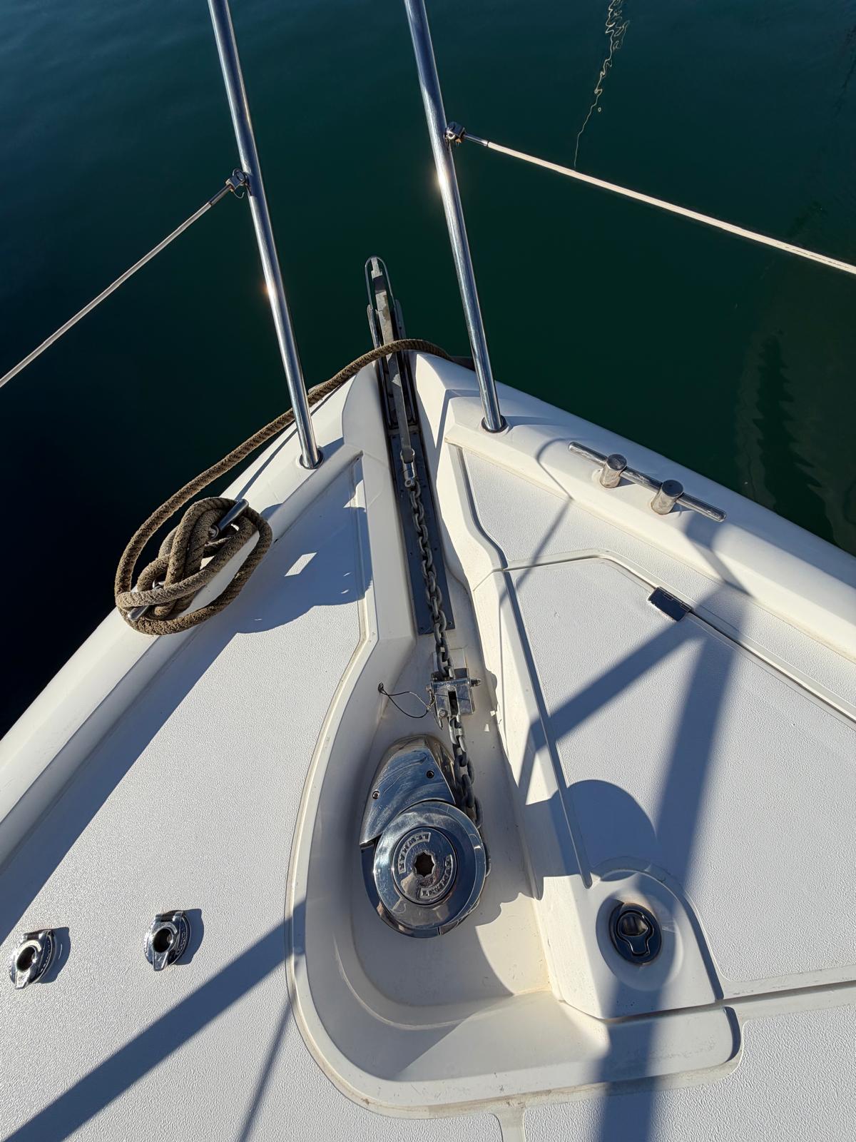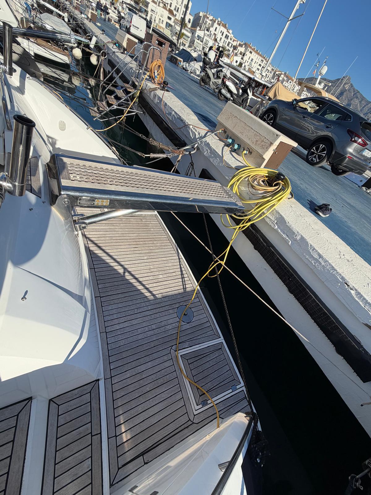 Equipment: Hot and cold air conditioning, 5Kw gasoline generator, battery charger with charge separator, double battery disconnector (3 Batt.) Hydraulic flaps, water heater, chain compartment, electric windlass with foot push buttons and button panel at the helm, anchor and bow hawse, VacuFlush electric toilet and crusher, black water tank emptying pump (20lts) bilge pumps in the bilge and in the cabin under the stairs, air extractor in the bilge, 12V electrical circuit panel and starter keys, 220v shore power socket and cable, speakers in cabin and cockpit, Belectric arm lifts engine cover, stern shower, bathing ladder, bow and stern bimini, new 2022 mooring cover, new original unused Camper canvas, complete new white 2022 winter cover, portable ice fridge, water pressure group, bow cushions, cockpit table in the bilge, boat hook, pole to hold the awning.