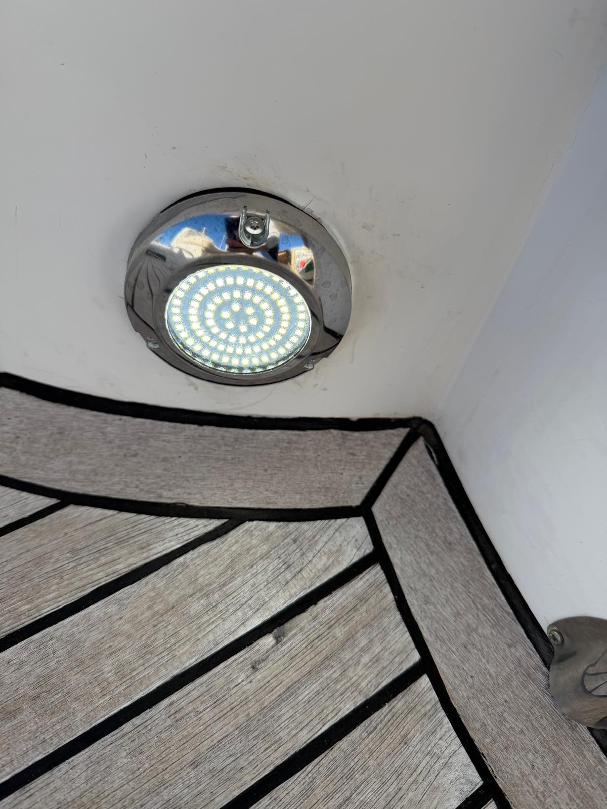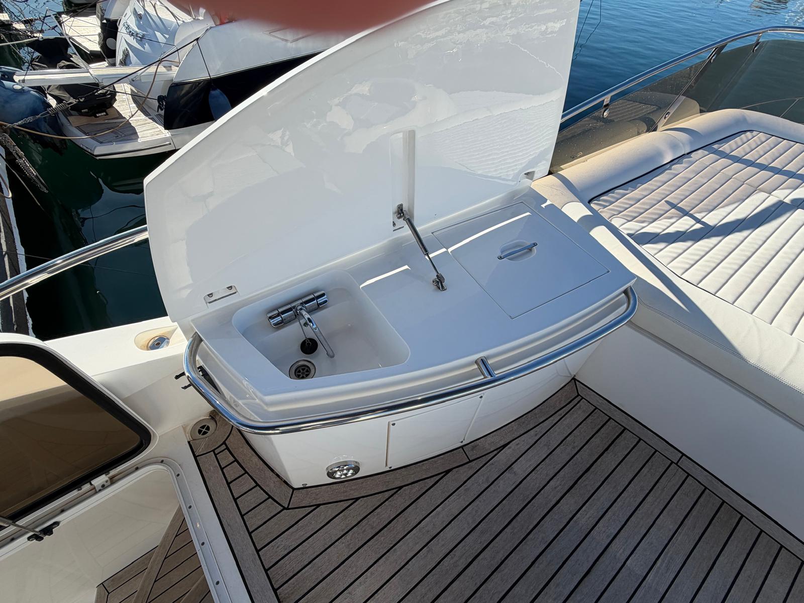 Exterior : L-shaped seat in the port bow cockpit, pilot seat, port stern seat convertible into a solarium, cockpit table, folding stern seat, radar arch with lights, various position lights and in radar arch position, VHF antenna, carpet in cockpit, sink unit in cockpit, battery disconnect switchboard on port side and starter key, cockpit exit door, starboard hatch, bathing platform, hatch in stern, bathing ladder, lights in cockpit.