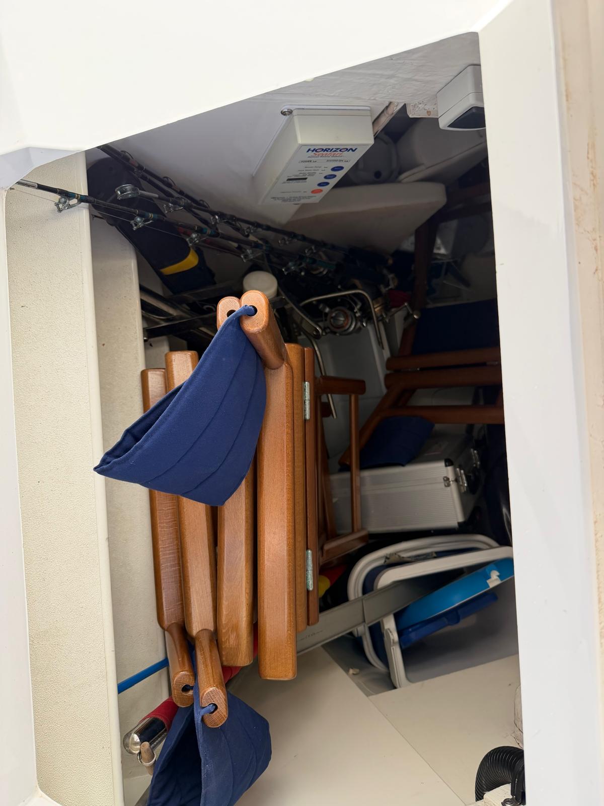 It also has white tarpaulins to close the bimini and have the entire cabin protected from wind and weather while we are in it. The bimini can be folded and stored in an appropriate locker (the lazarette) on the deck of the boat.