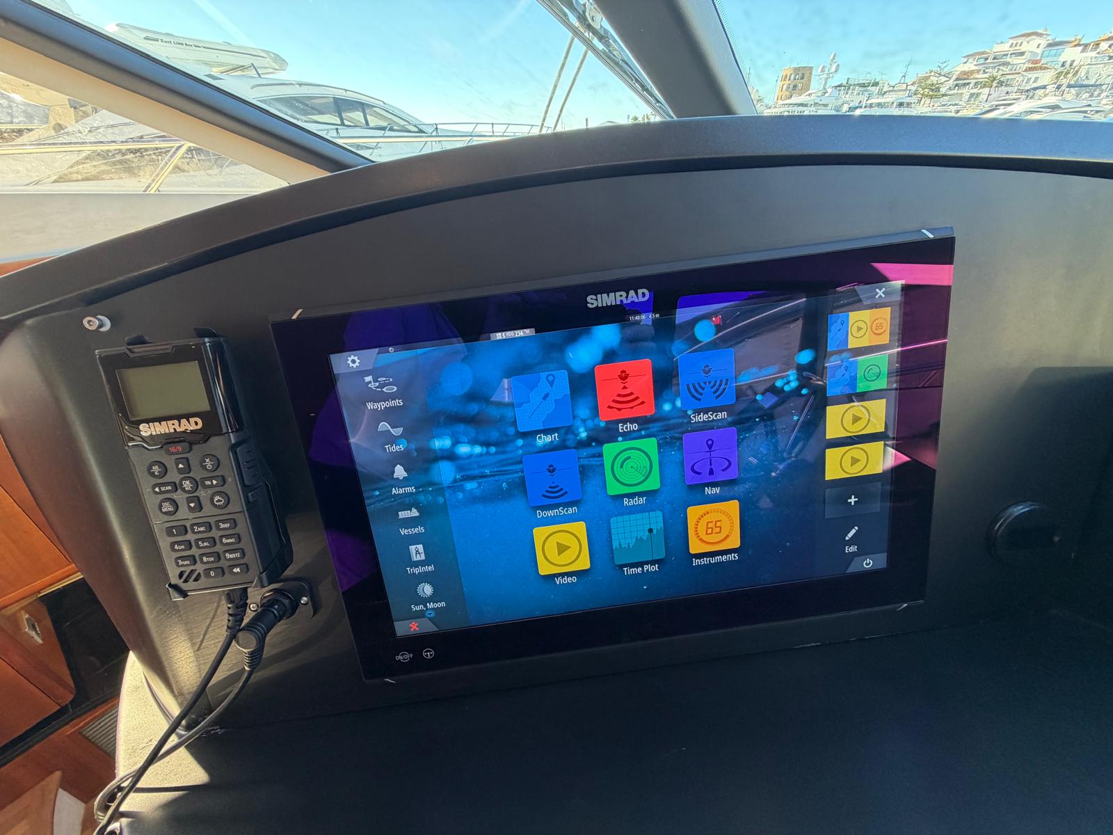 Electronics: Engine control panel, Fuse panel, VHF HM 390 with DSC, Compass, Smart Craft, Switch for trailer, Bow light control, Clarion radio control, 12V charger plug, all this in control panel, TV antenna,