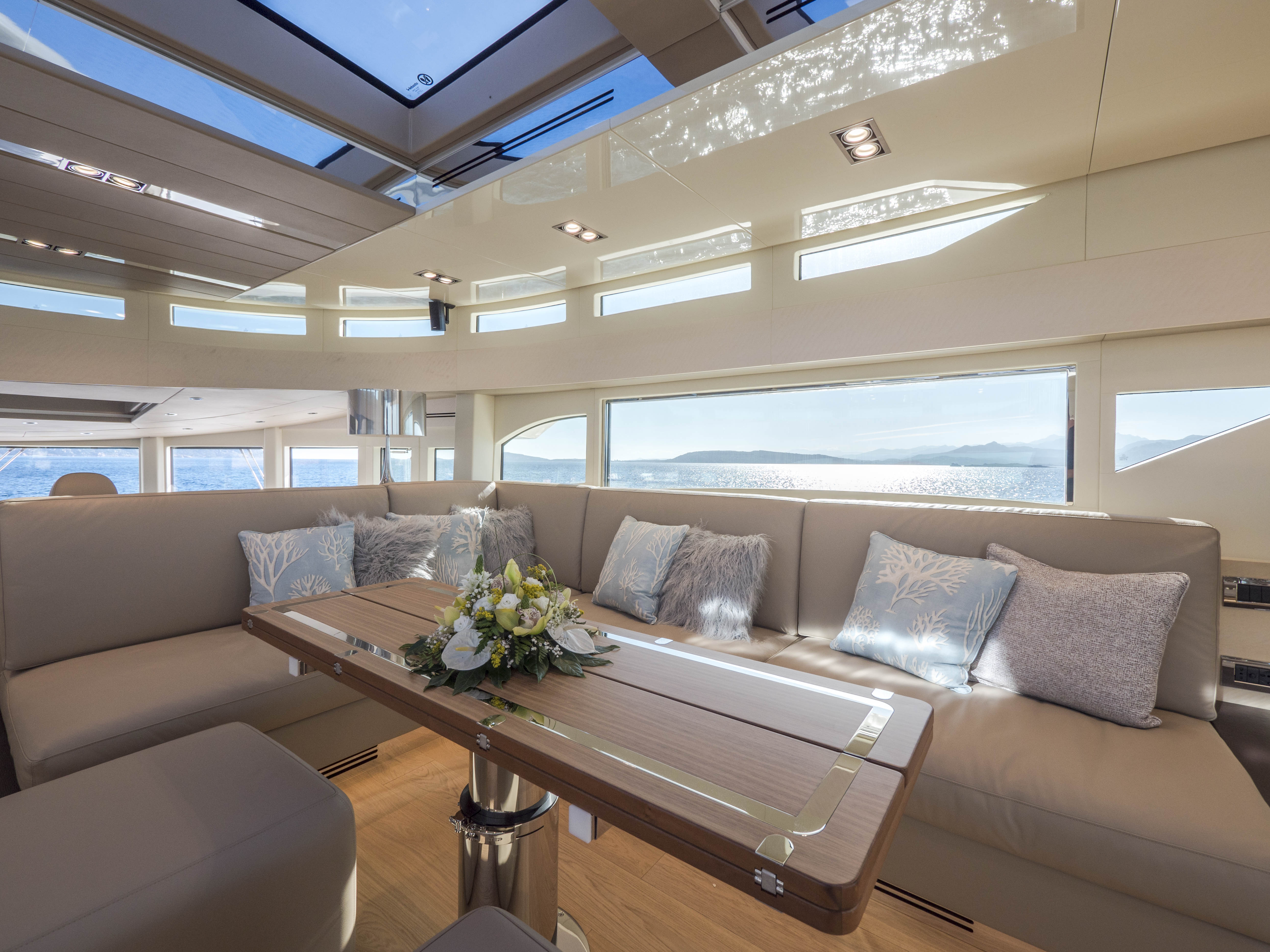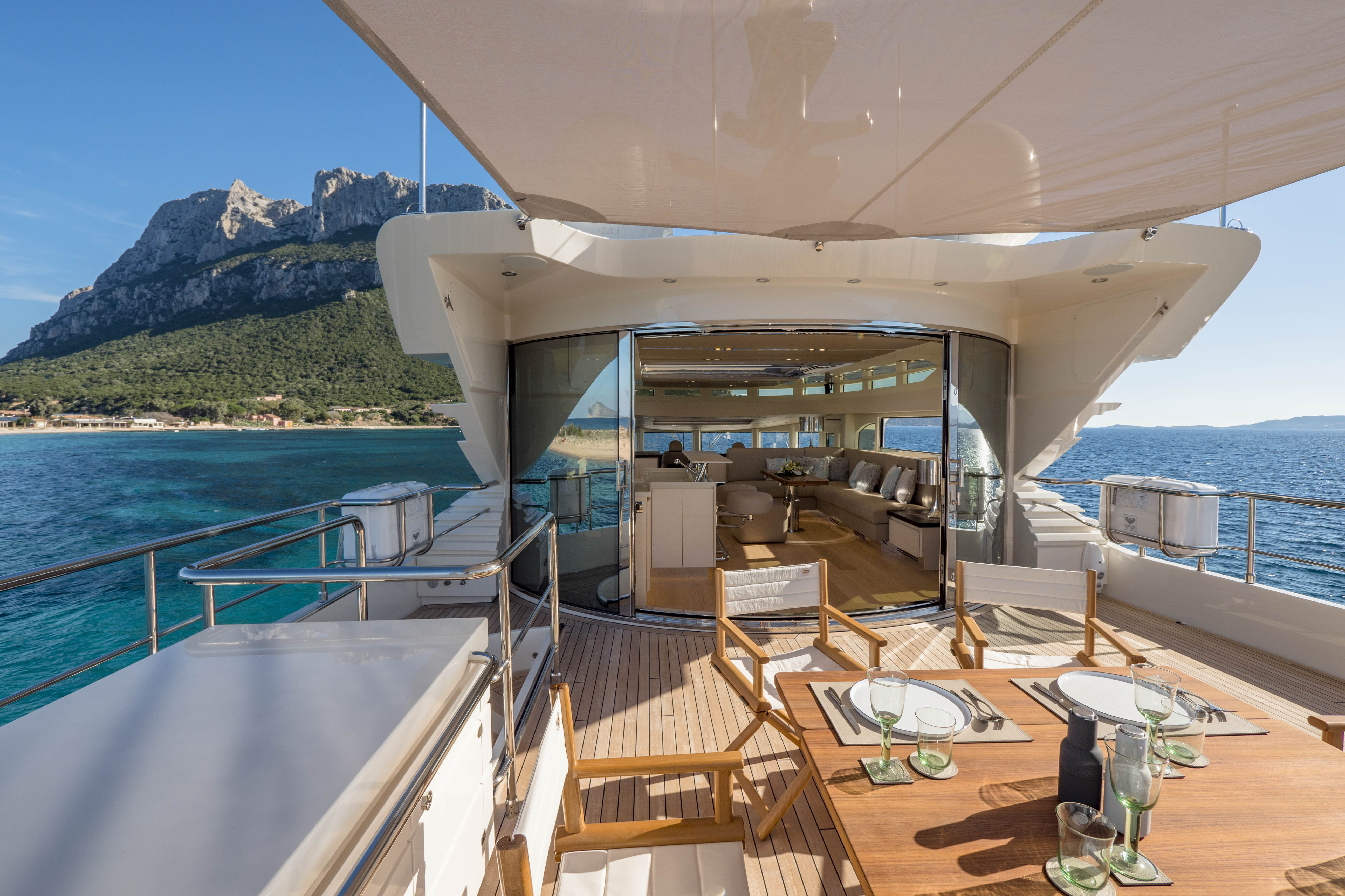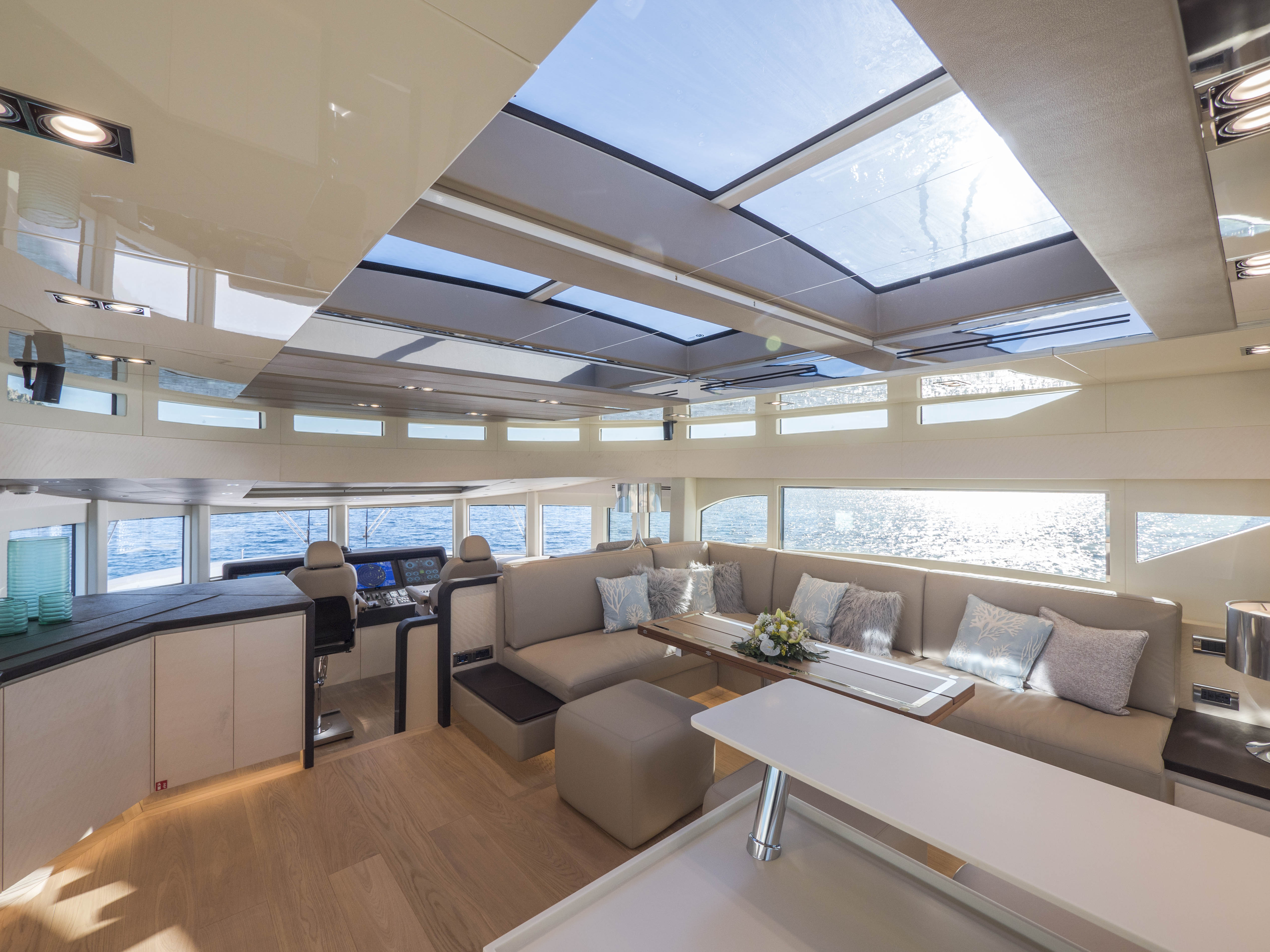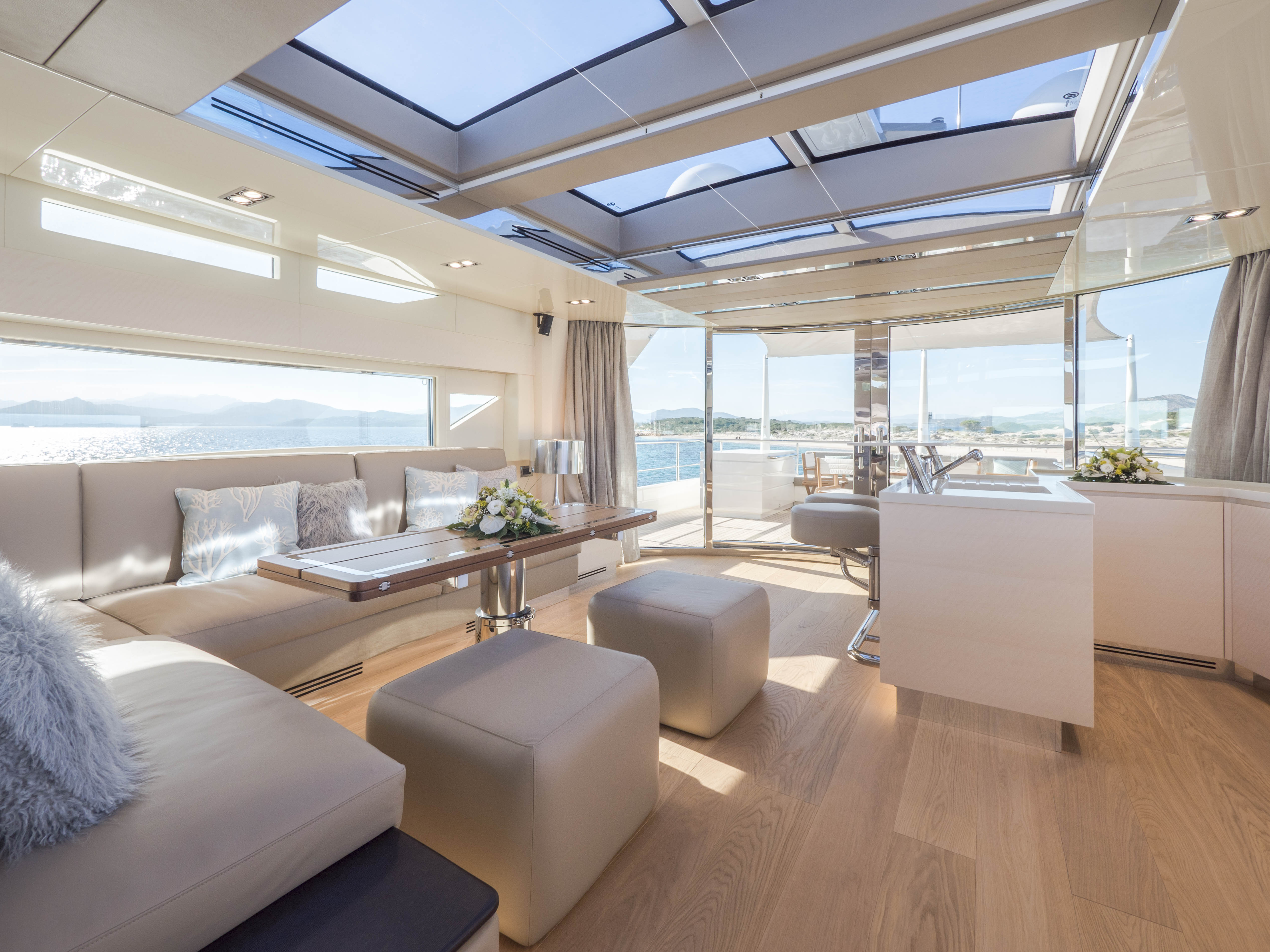 FILIPPETTI NAVETTA 26 - CONVERTIBLE: A MASTERPIECE TO SAIL THE OCEAN Filippetti Navetta 26: the ideal yacht to sail throughout the year Sailing the North European seas in all temperature and weather conditions is now possible with the Filippetti Navetta 26 – Convertible. Thanks to a special thermal insulation system, this boat can sail even in the coldest seasons. The use of a special insulating glass guarantees perfect thermal insulation inside. In consideration of the cold temperatures of Northern Europe, a KABOLA oil boiler system was installed to preheat the boat prior to boarding for increased comfort. INDEPENDENCE ON BOARD One of the main innovations of this 26-meter yacht is the possibility to manage the boat without the need for a professional crew. In addition to the main helm station, in fact, the yacht includes four additional remote command locations, two forward and two aft of the main deck, to facilitate anchorage maneuvers. Remote control is equally possible via mobile devices, like smartphones and tablets. TWO VERSIONS FOR THE FLY DECK As usual, Filippetti offers various layouts for the Navetta 26 Convertible. New owners can choose between two different flydeck versions: “open”, with wide terrace, wet bar, sun pad and dining area; “closed”, with a spacious living room perfect for entertaining guests, complete with a large bar and adjustable dining table. DISCOVER THE OPEN VERSION