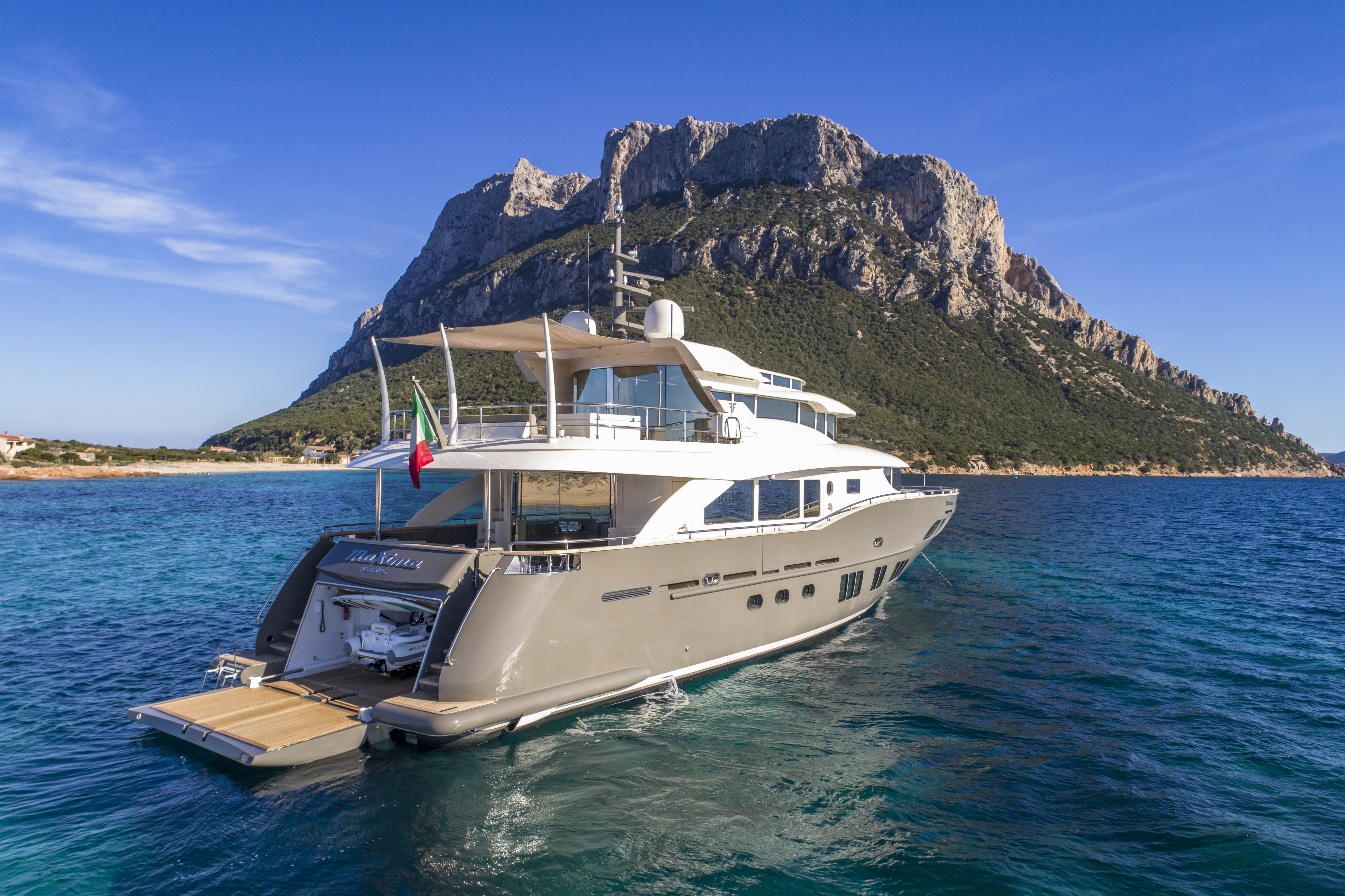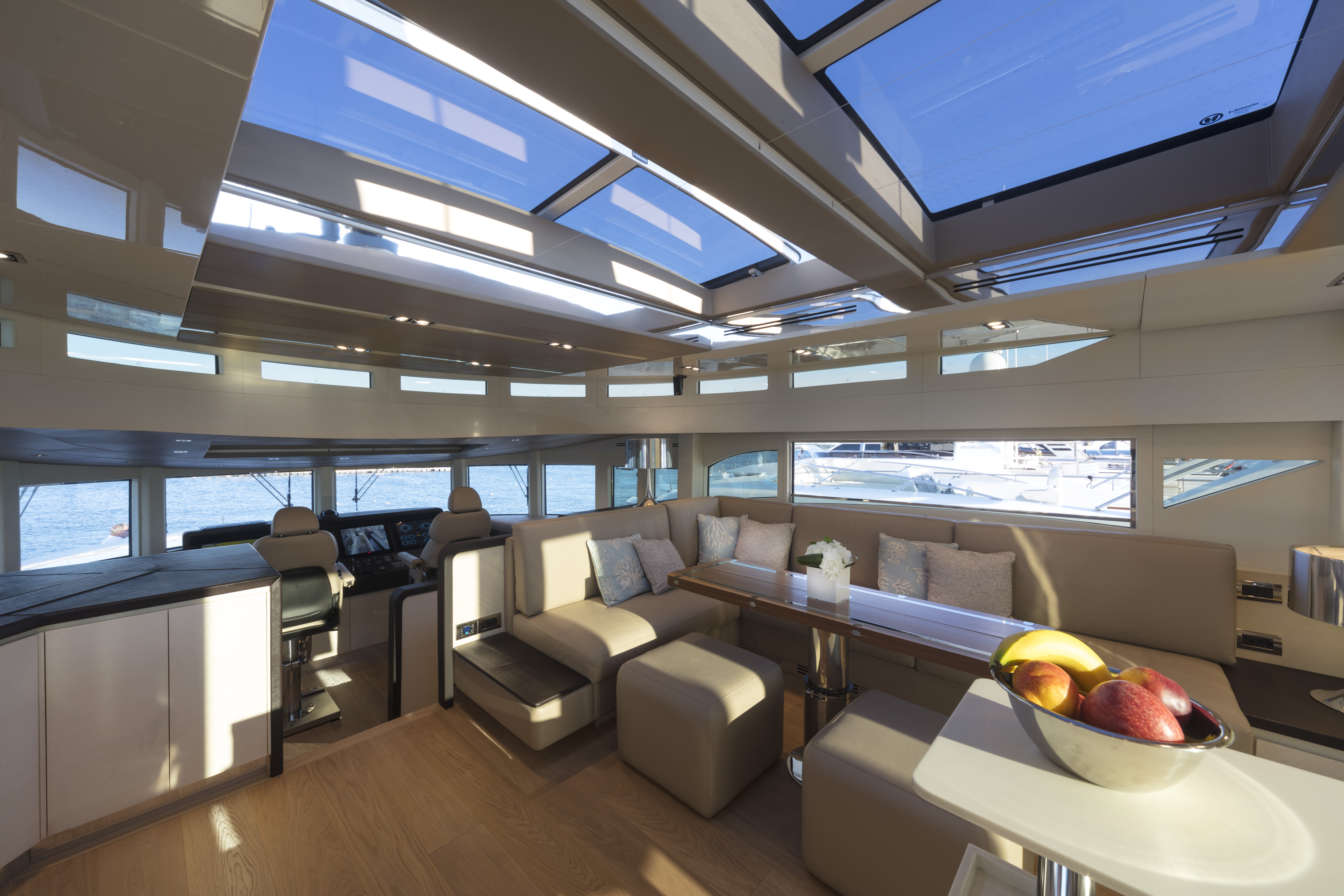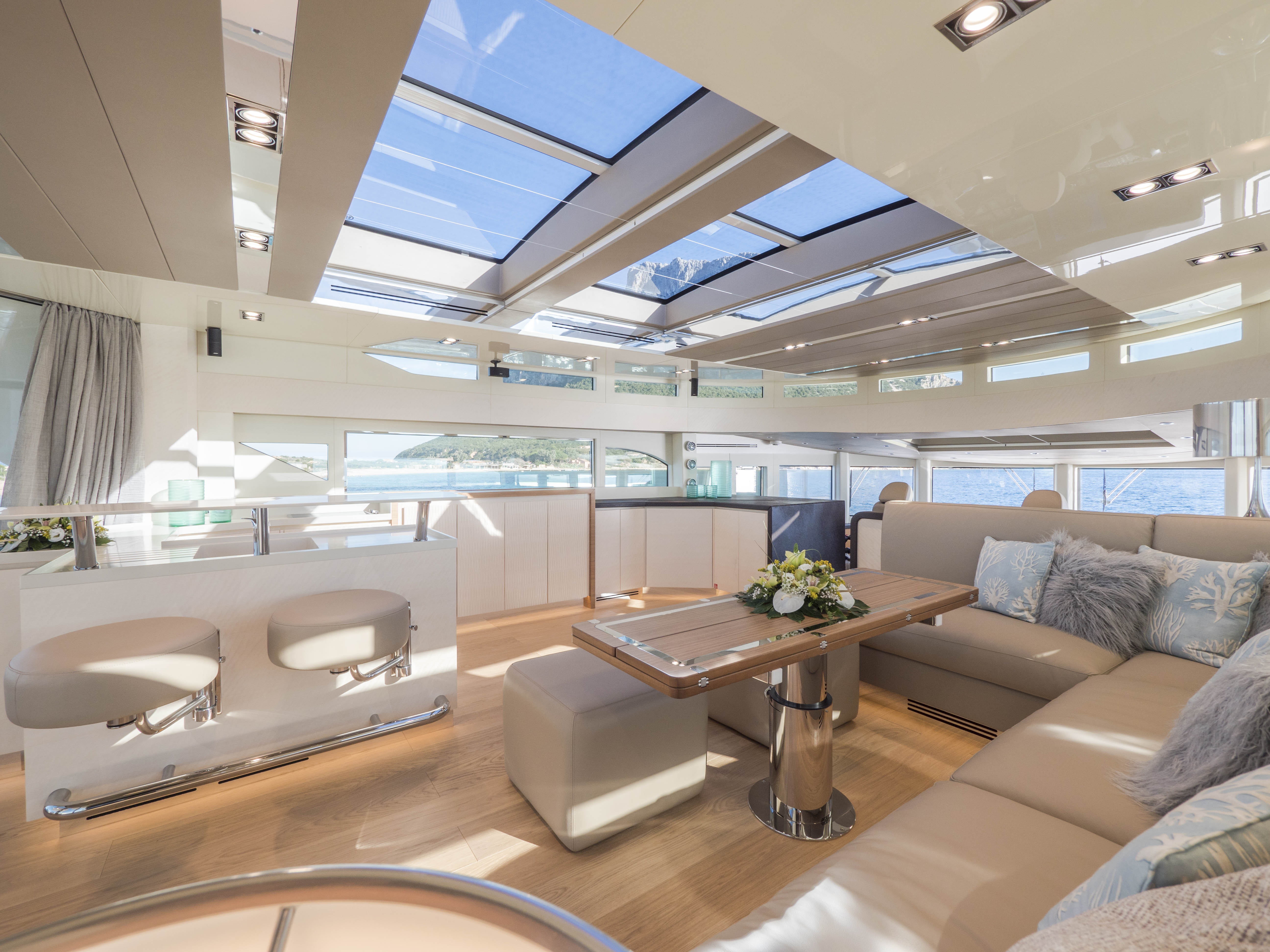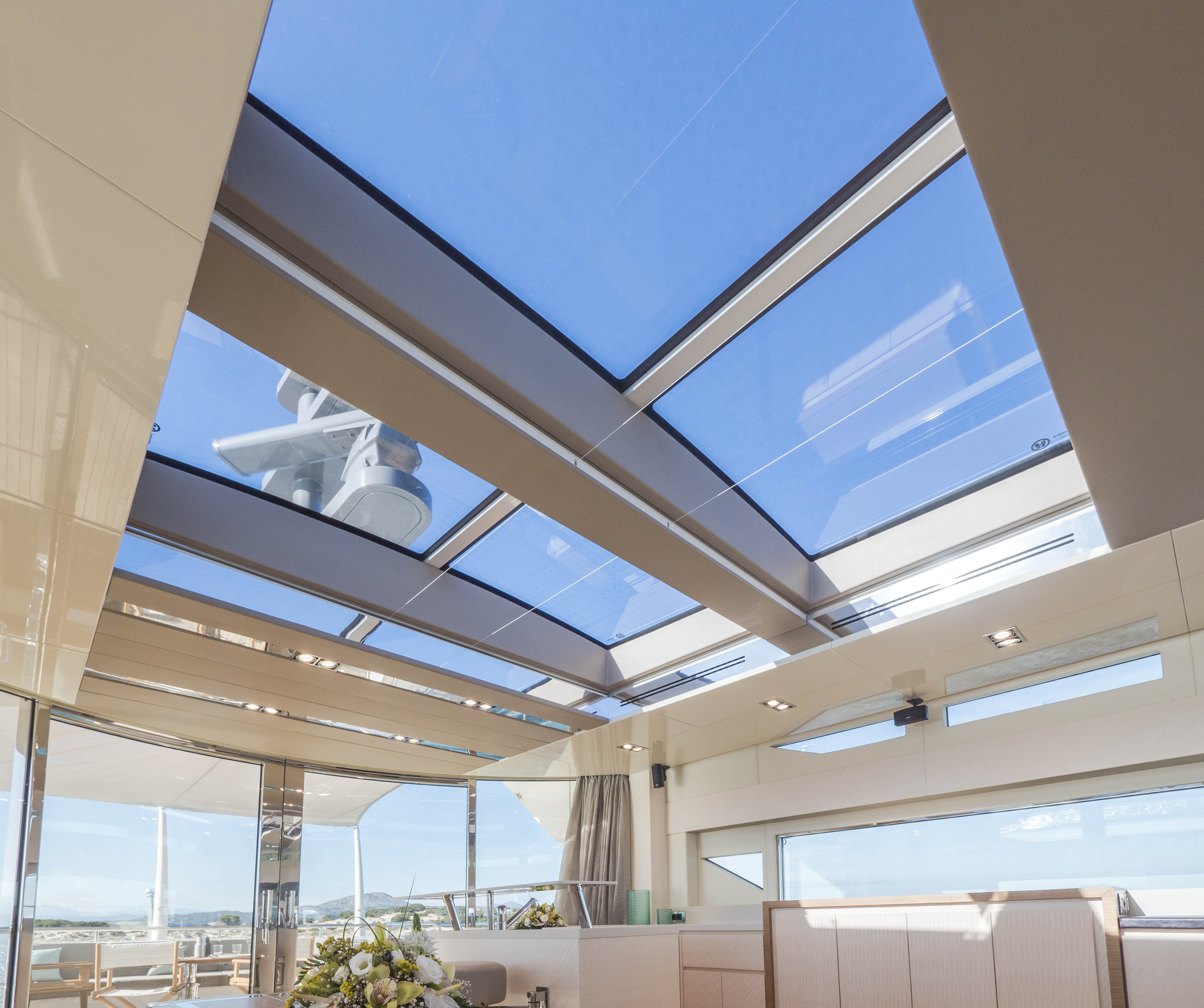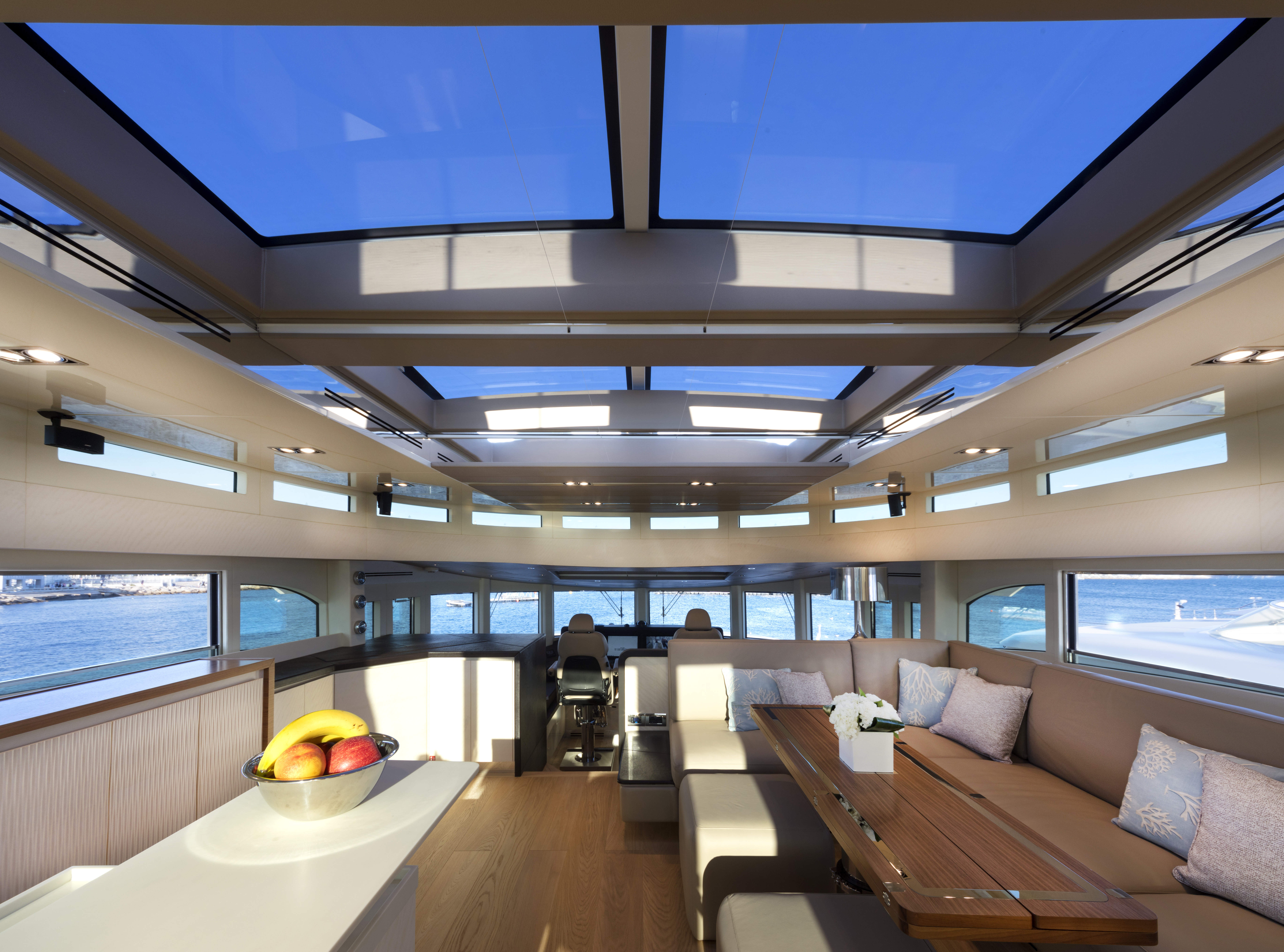 FILIPPETTI NAVETTA 26 - CONVERTIBLE: A MASTERPIECE TO SAIL THE OCEAN Filippetti Navetta 26: the ideal yacht to sail throughout the year Sailing the North European seas in all temperature and weather conditions is now possible with the Filippetti Navetta 26 – Convertible. Thanks to a special thermal insulation system, this boat can sail even in the coldest seasons. The use of a special insulating glass guarantees perfect thermal insulation inside. In consideration of the cold temperatures of Northern Europe, a KABOLA oil boiler system was installed to preheat the boat prior to boarding for increased comfort. INDEPENDENCE ON BOARD One of the main innovations of this 26-meter yacht is the possibility to manage the boat without the need for a professional crew. In addition to the main helm station, in fact, the yacht includes four additional remote command locations, two forward and two aft of the main deck, to facilitate anchorage maneuvers. Remote control is equally possible via mobile devices, like smartphones and tablets. TWO VERSIONS FOR THE FLY DECK As usual, Filippetti offers various layouts for the Navetta 26 Convertible. New owners can choose between two different flydeck versions: “open”, with wide terrace, wet bar, sun pad and dining area; “closed”, with a spacious living room perfect for entertaining guests, complete with a large bar and adjustable dining table. DISCOVER THE OPEN VERSION