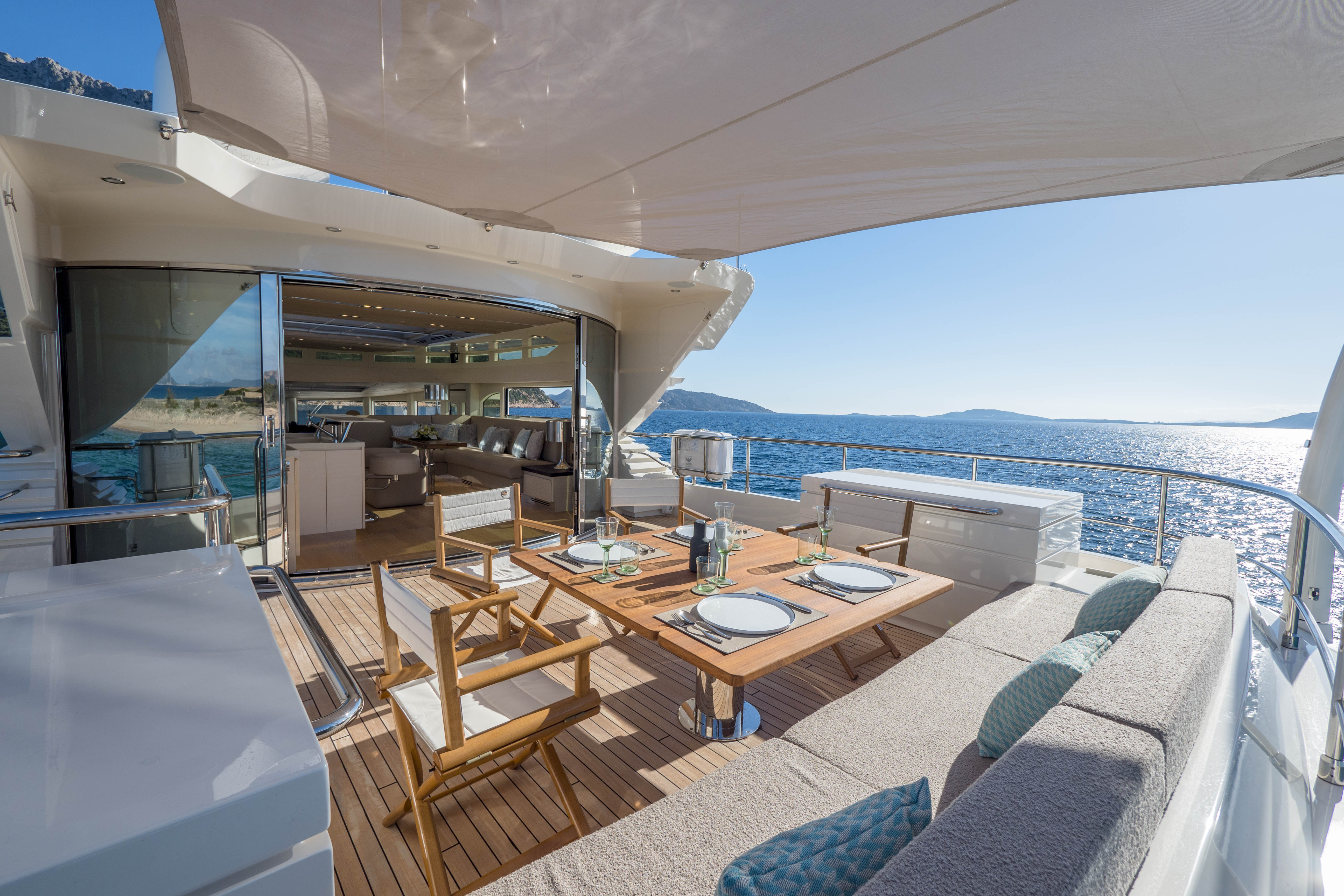 FILIPPETTI NAVETTA 26 - CONVERTIBLE: A MASTERPIECE TO SAIL THE OCEAN Filippetti Navetta 26: the ideal yacht to sail throughout the year Sailing the North European seas in all temperature and weather conditions is now possible with the Filippetti Navetta 26 – Convertible. Thanks to a special thermal insulation system, this boat can sail even in the coldest seasons. The use of a special insulating glass guarantees perfect thermal insulation inside. In consideration of the cold temperatures of Northern Europe, a KABOLA oil boiler system was installed to preheat the boat prior to boarding for increased comfort. INDEPENDENCE ON BOARD One of the main innovations of this 26-meter yacht is the possibility to manage the boat without the need for a professional crew. In addition to the main helm station, in fact, the yacht includes four additional remote command locations, two forward and two aft of the main deck, to facilitate anchorage maneuvers. Remote control is equally possible via mobile devices, like smartphones and tablets. TWO VERSIONS FOR THE FLY DECK As usual, Filippetti offers various layouts for the Navetta 26 Convertible. New owners can choose between two different flydeck versions: “open”, with wide terrace, wet bar, sun pad and dining area; “closed”, with a spacious living room perfect for entertaining guests, complete with a large bar and adjustable dining table. DISCOVER THE OPEN VERSION
