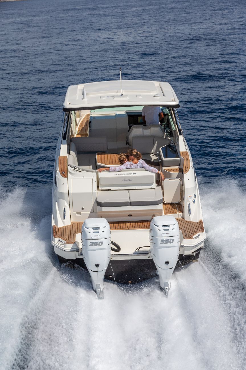 El Sundancer 320 fueraborda es la continuidad de un nuevo capítulo en la historia de Sundancer, combinando así los valores de un crucero con los de una embarcación deportiva de proa abierta en un cautivador y armonioso pack. Gracias a nuevos conceptos de arquitectura, el área de la proa es más utilizable, la bañera es amplia y versátil y la cabina nos permite descansar relajadamente del sol o pasar una agradable noche. Y con el motor fueraborda conservas el espacio y el confort. El Sundancer 320 OB reimagina las posibilidades de cómo un crucero puede verse y sentirse.