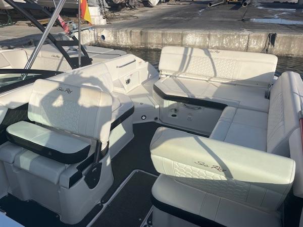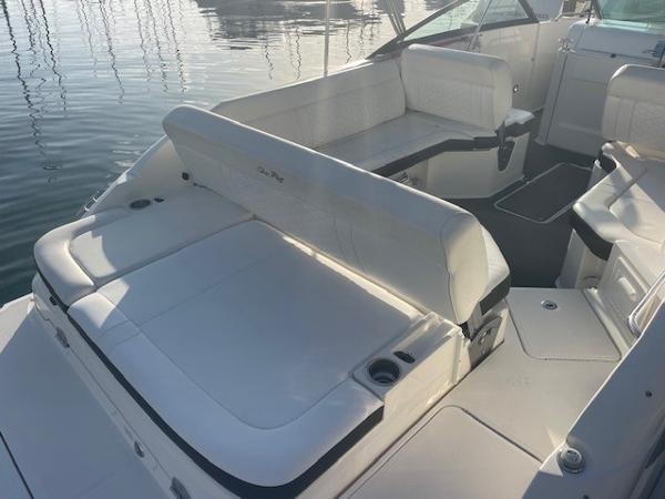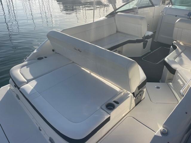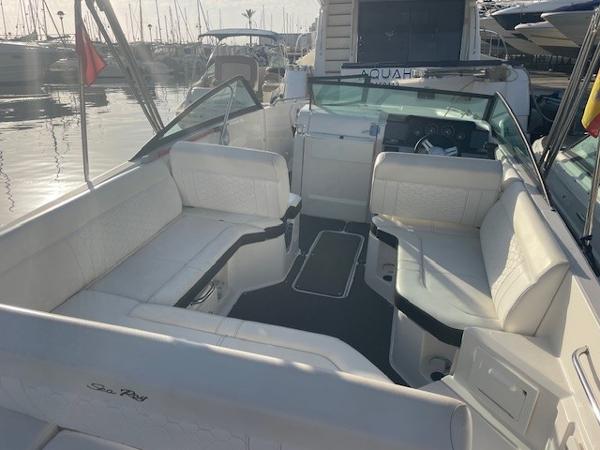 SEA RAY 250 SDXE (2018). Mercruiser 6.2 mpi dts 350 cv, 621 hours. Exhaust manifold changed this year. Always stored in a shed off-season. Cabin. Shower in the stern. The Sea Ray SDX 250 is the go-to for effortless family day boating. Its design reflects a marriage of Sea Ray's expertise and modern consumers' preferences, including a layout that encourages socialization and relaxation, and technology that ensures ease of use. With impressive seating capacity, huge versatility, abundant storage and stylish good looks, the SDX 250 invites families of novice and experienced boaters alike to make every weekend a joyous escape. At the heart of every SDX beats an athletic pulse. Designed for precision performance and power, a fast and smooth ride is guaranteed. Available options like a sleek forward-facing and folding watersports tower lift your wakeboarding and skiing possibilities, while an available bimini top lends shade as desired. And when the time comes to don or doff your gear, huge transom staging seats with hidden gear storage make the process a breeze Mooring available.